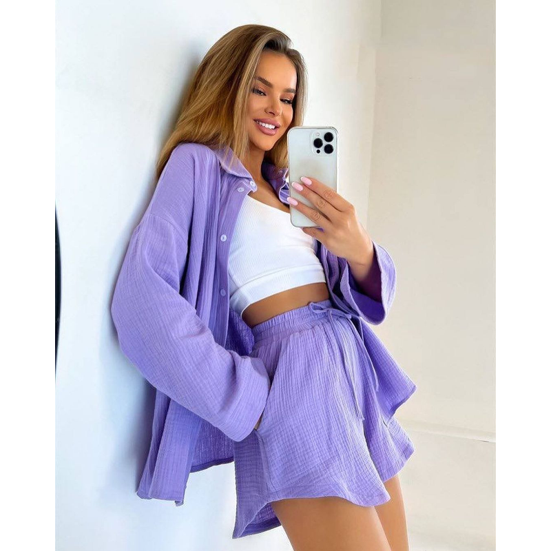 Long Sleeve Shirt Shorts Suit Women Purple S