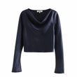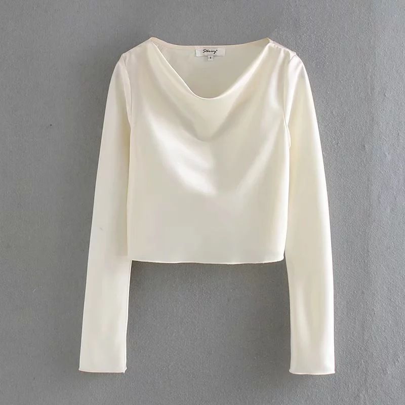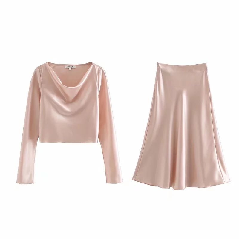Long sleeve short T-shirt + satin skirt casual suit Navy Blue S