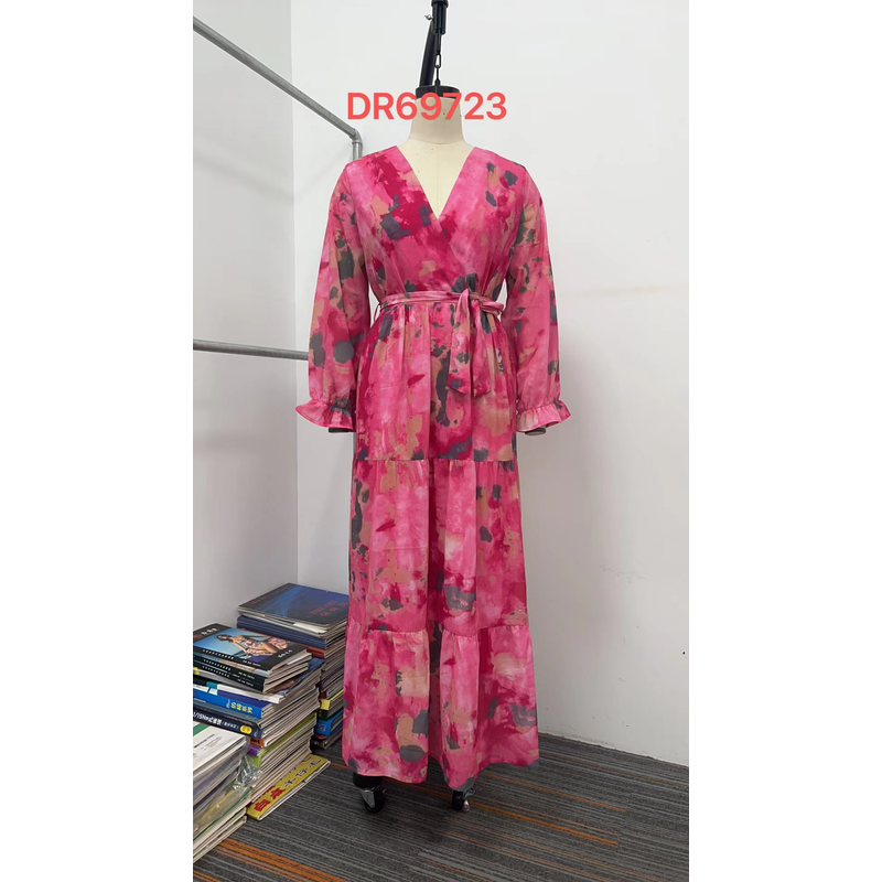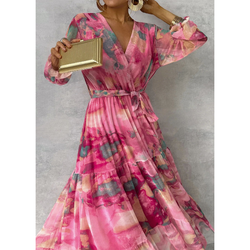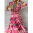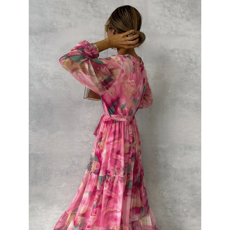 Long-sleeved Floral Print Dress Elegant V-neck Pleated High-waisted Big Swing Chiffon Maxi Dresses For Women Clothing Rose Red M