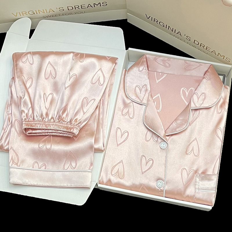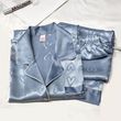 Long-Sleeved Trousers Simulation Silk Pajamas Female Autumn and Winter Cardigan Lapel Student Pajamas Love Blue Women's Homewear
