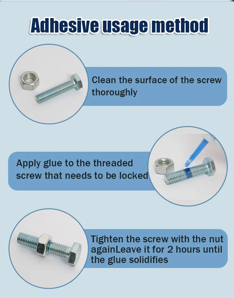 5. Simple Operation: Just apply a dab of the thread locker to the fixing position of the bolt & nut, And then it will Start to Cure in 10 Minutes, And your items can be used normally after 24 hours of fully cured. The peak nozzle design with pull-up opening and downward pressure sealing can easily maintain the long-term effectiveness of the glue and enable precise and controllable application.