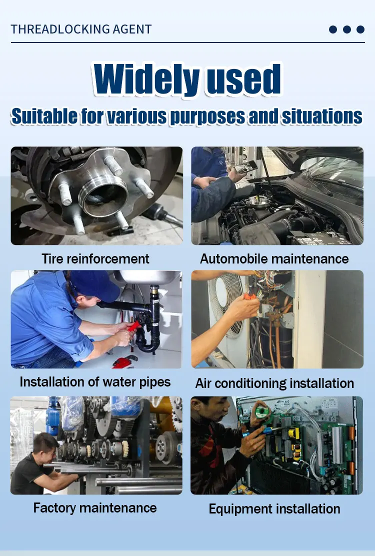1. Lock Tight Thread Locker: Can fasten bolts & nuts for a long time to avoid loosening due to vibration or shock, Even in extreme environments such as high vibration, high humidity, ultra-high or ultra-low temperature. A must-have for extending the service life and safe use of metal fasteners!
