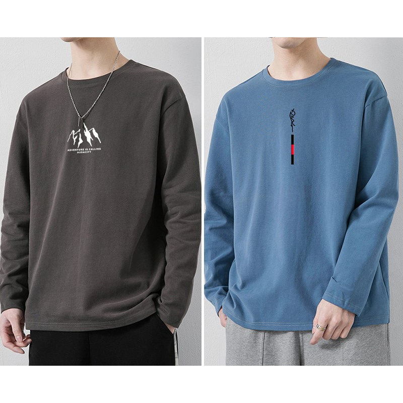 Loose Casual Cotton Long Sleeve T-shirt For Men Dark grey and grey blue L