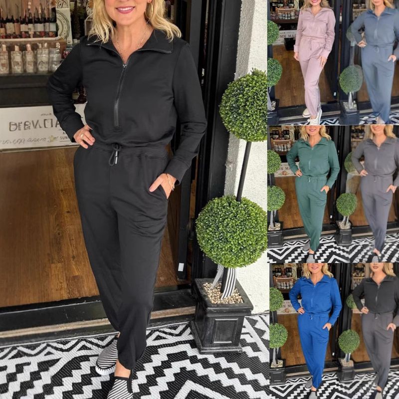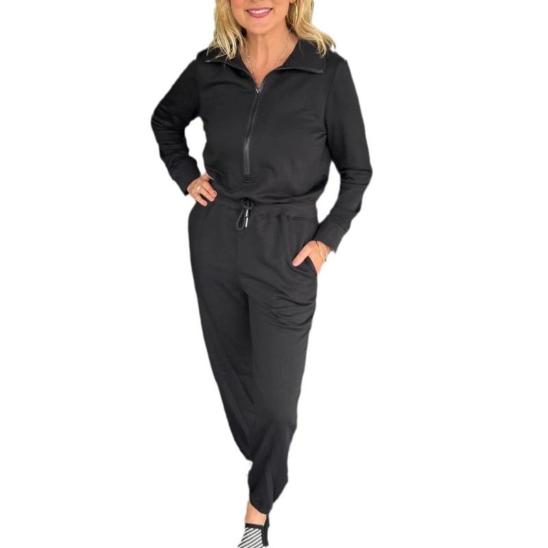 Loose Zip Long Sleeve Polo Collar Jumpsuit Women 2XL Black