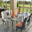 怐High-End Dining Table怑The dining room table is capable of handling high pressure and 66lbs weight loads, the luxury sintered stone table topfeatures unique textures,supported by black-painted metal legs for a modern aestheticsand high-end look, makes the space open and larger, blend seamlessly into your dining area