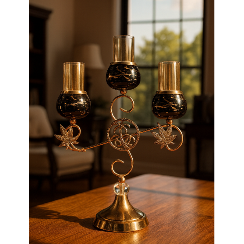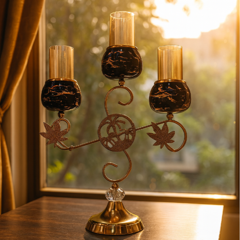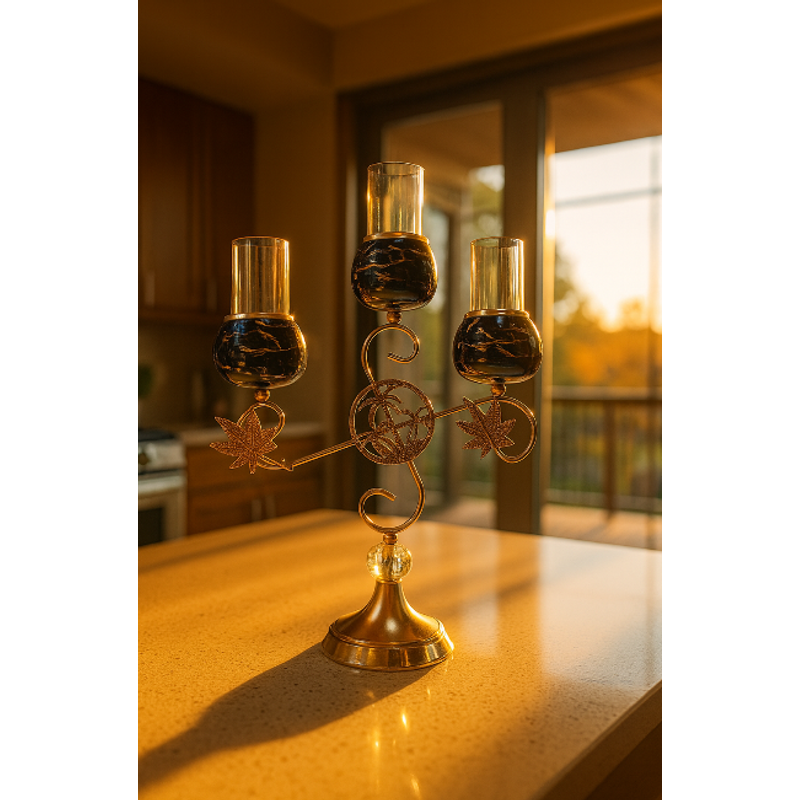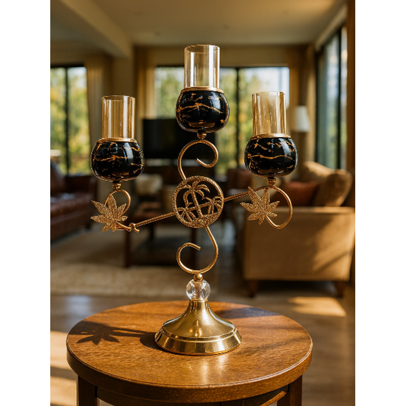 Enhance your interior ambiance with this Luxury 3-Head Golden Candle Holder, an exquisite blend of classic charm and modern sophistication. Featuring three beautifully crafted glass candle cups with a sleek black marble-style finish, this piece stands tall on an ornate golden metal frame adorned with elegant leaf motifs and a crystal-accented base.
