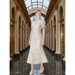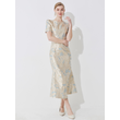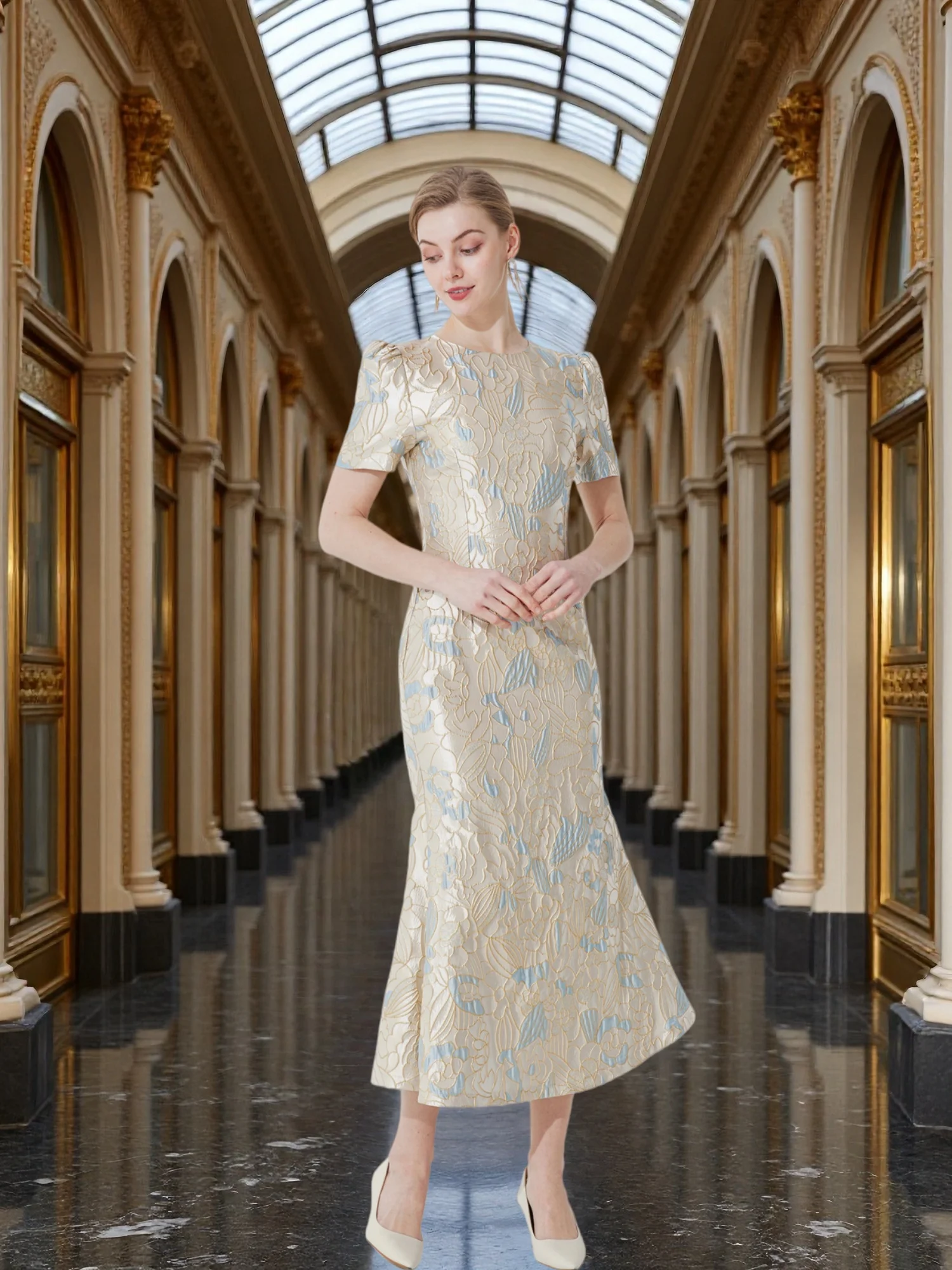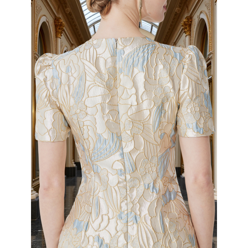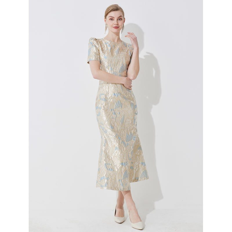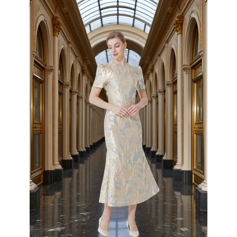 Luxury Champagne Gold and Blue Jacquard Dress for Women Featuring a Waist-Cinching Mermaid Maxi Silhouette