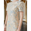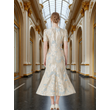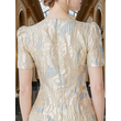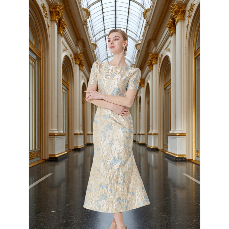Luxury Champagne Gold and Blue Jacquard Dress for Women Featuring a Waist-Cinching Mermaid Maxi Silhouette