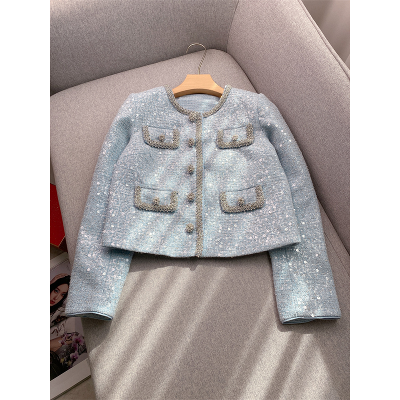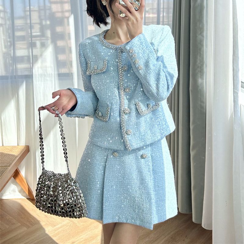 Luxury Evening Short Dresses 2 Piece Skirt Sets Women Sequins Tweed Jackets A Line Mini Skirts Suits 2pcs Outfit Office Lady