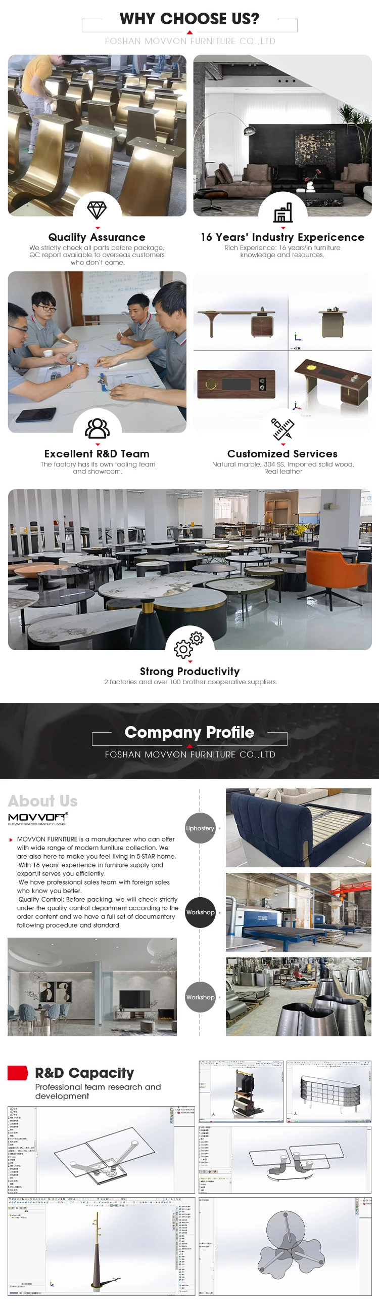Q1: Are you trading company or manufacturer ? A1:We are direct manufacturer located in Foshan. Q2:What’s your main products? A2: Modern dining room furniture&living room furniture. Q3: Do you customize products? A3: Yes,we are skillful in customization with clients’ design,drawing or photo. Various size, finishing, material can be optional. Q4: How to be your exclusive agent? A4: It depends on some annual purchase plan, Q5:What’s your delivery time? A6:Sample order: 7-10 days, Full container: 25-45 days up to different models. Q6:How much is your shipping cost please? A7:Because furniture is heavy product,shipping by sea is best choice. Full container will save you more rates.LCL is workable but more strict request in package strength and material, plywood case is obligated.