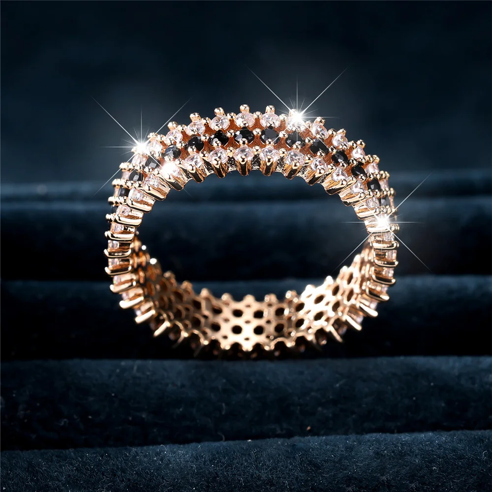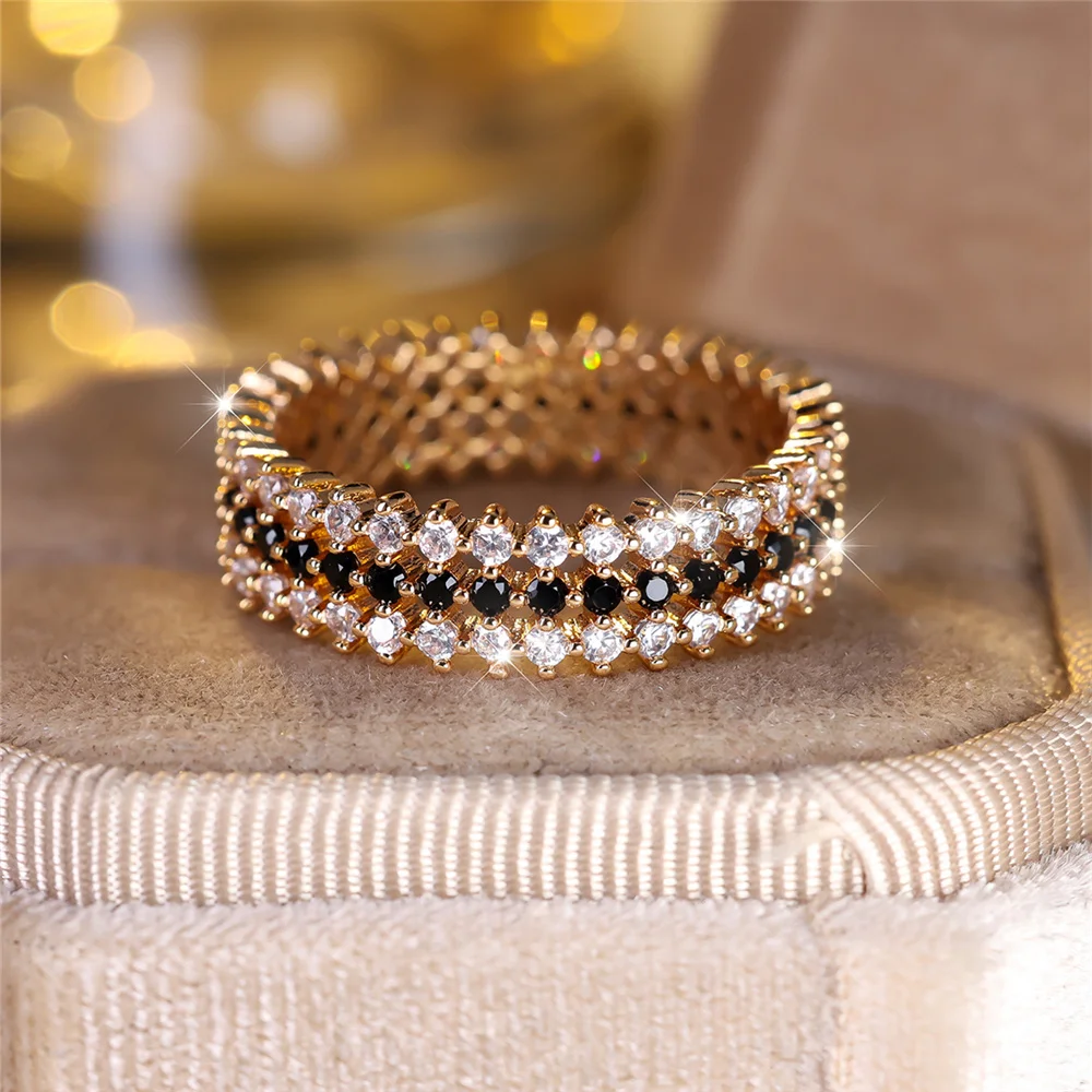 Luxury Female White Black Round Zircon Stone Ring Dainty Gold Color Wedding Jewelry For Women