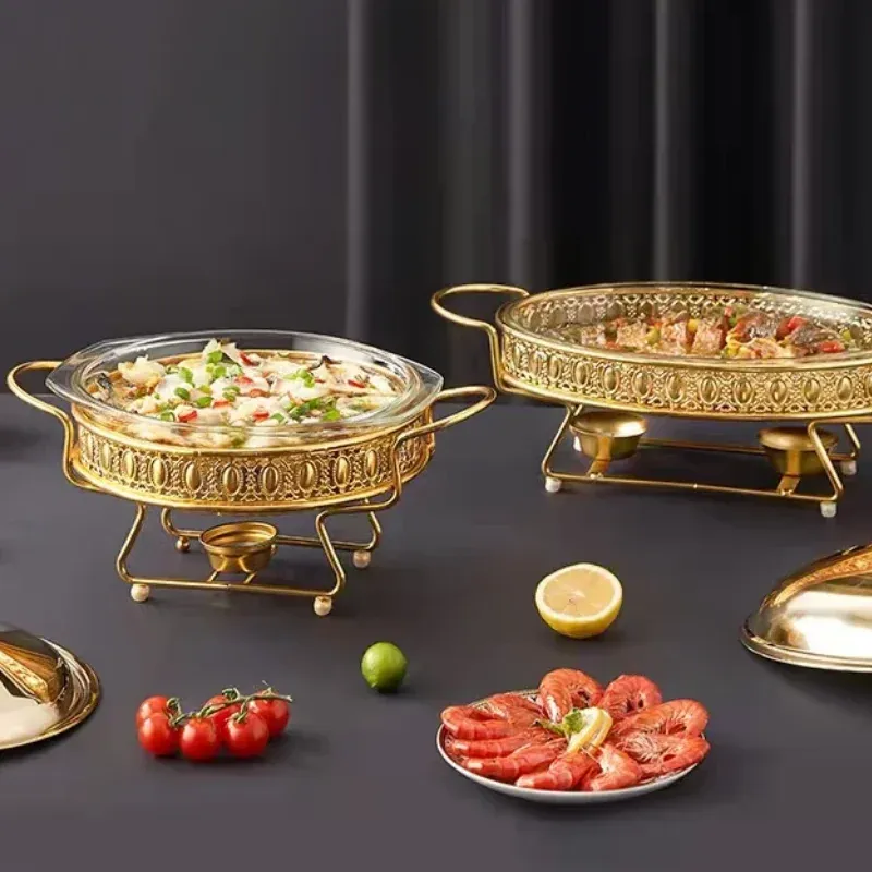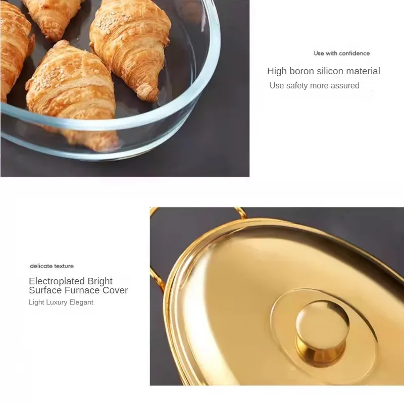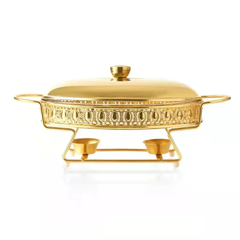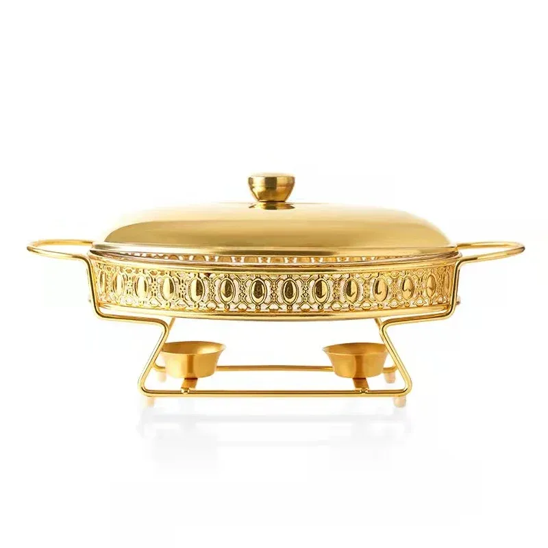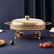 The Luxury Golden Oval Food Warmer is a stylish addition to any event, with its elegant stainless steel chafing dish and glass lid.