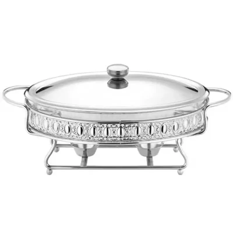The Luxury Golden Oval Food Warmer is a stylish addition to any event, with its elegant stainless steel chafing dish and glass lid.