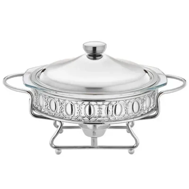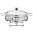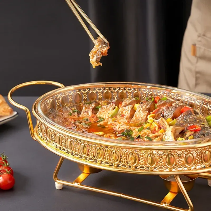 The Luxury Golden Oval Food Warmer is a stylish addition to any event, with its elegant stainless steel chafing dish and glass lid.