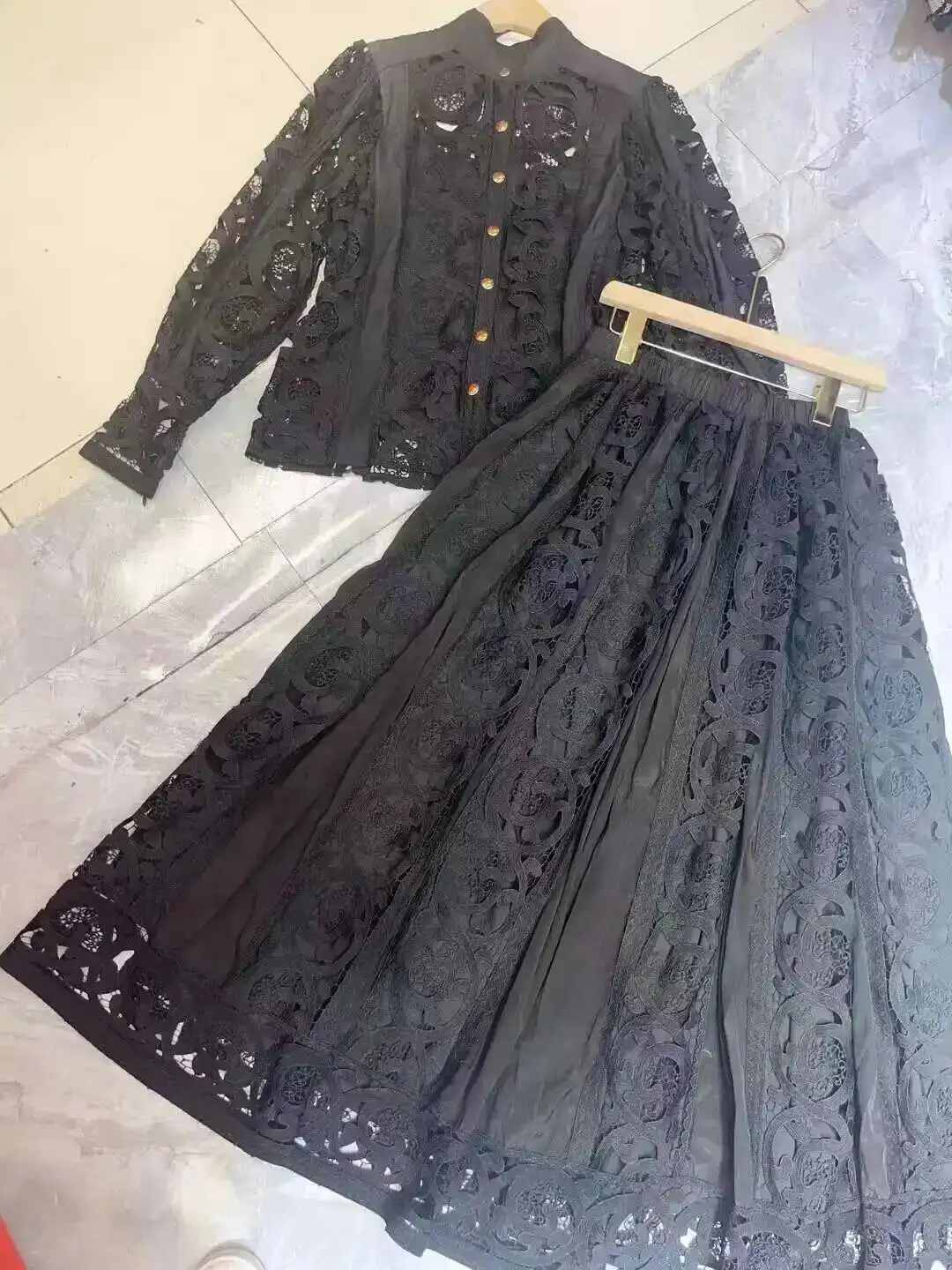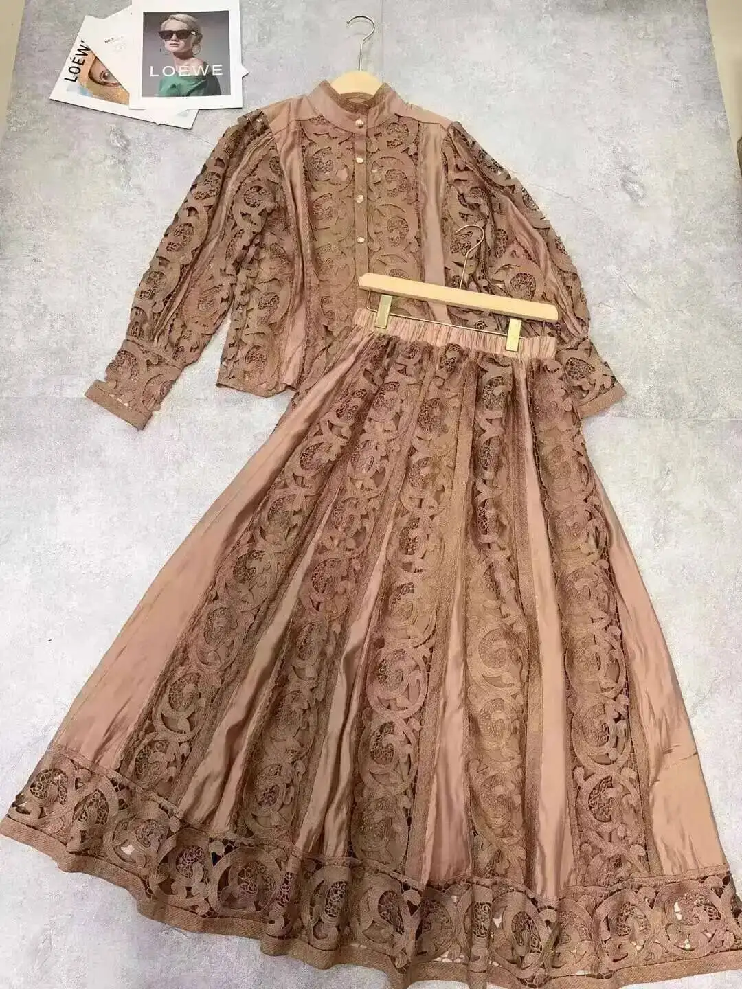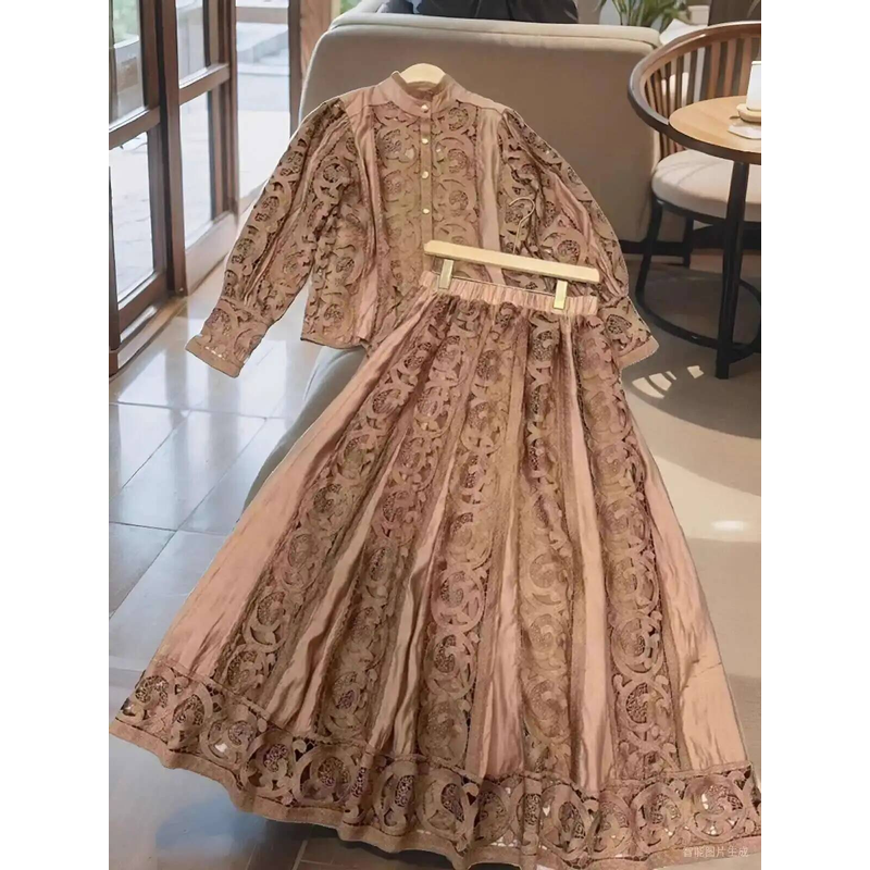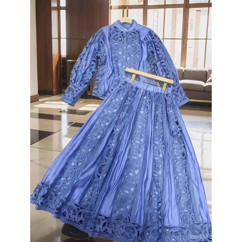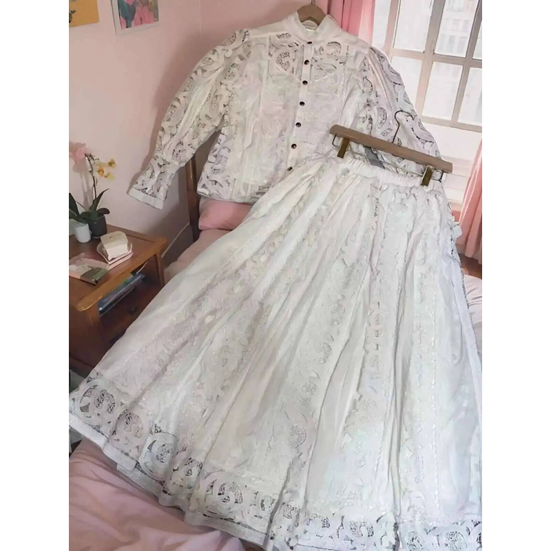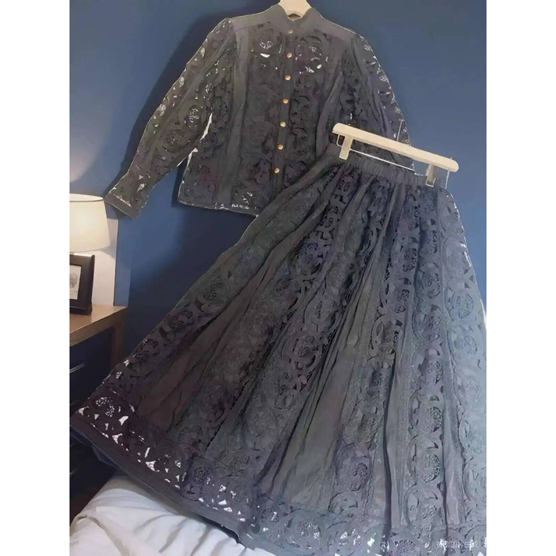 Luxury Long Sleeve Midi Dress Suits 2 Piece Women Skirts Sets Summer Autumn Hollow Out 3pcs Shirts Top Elastic Loose Big Dresses