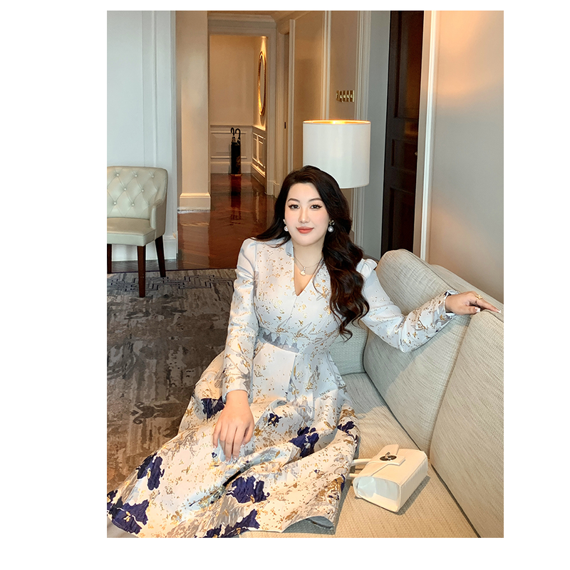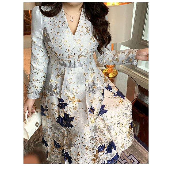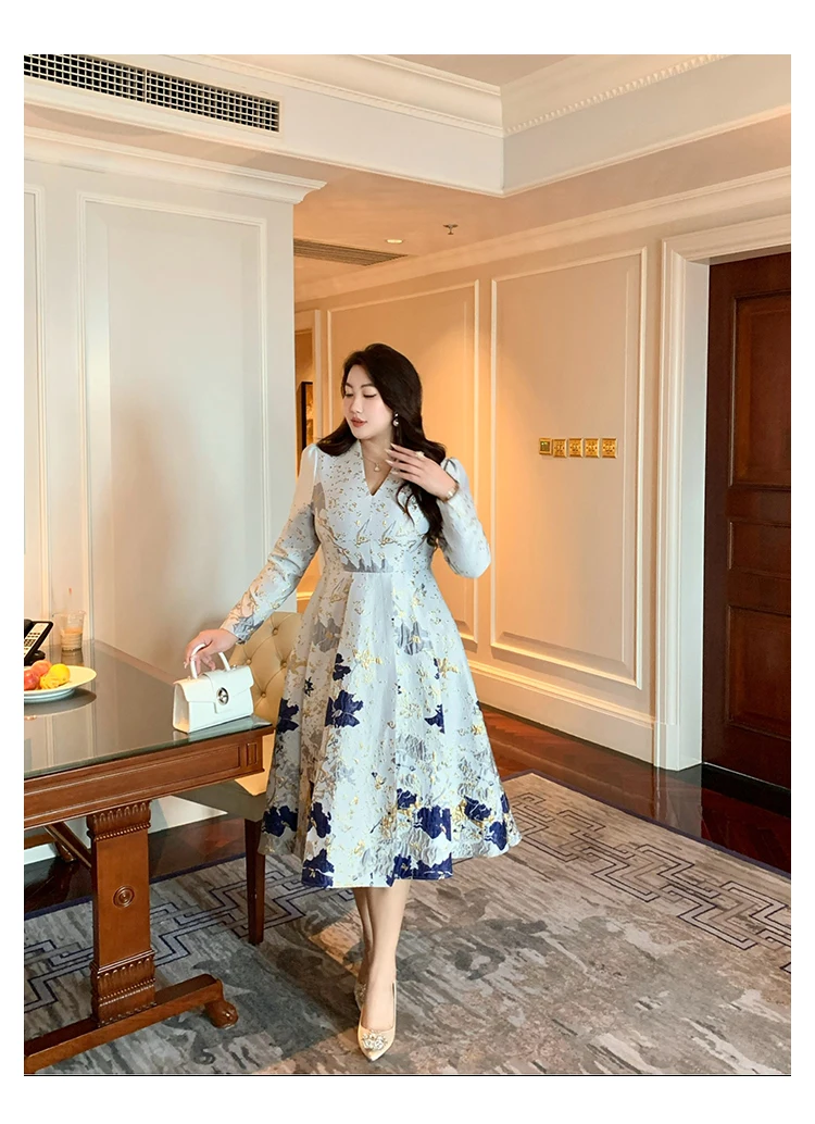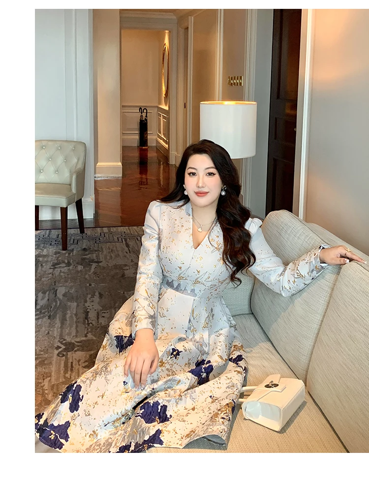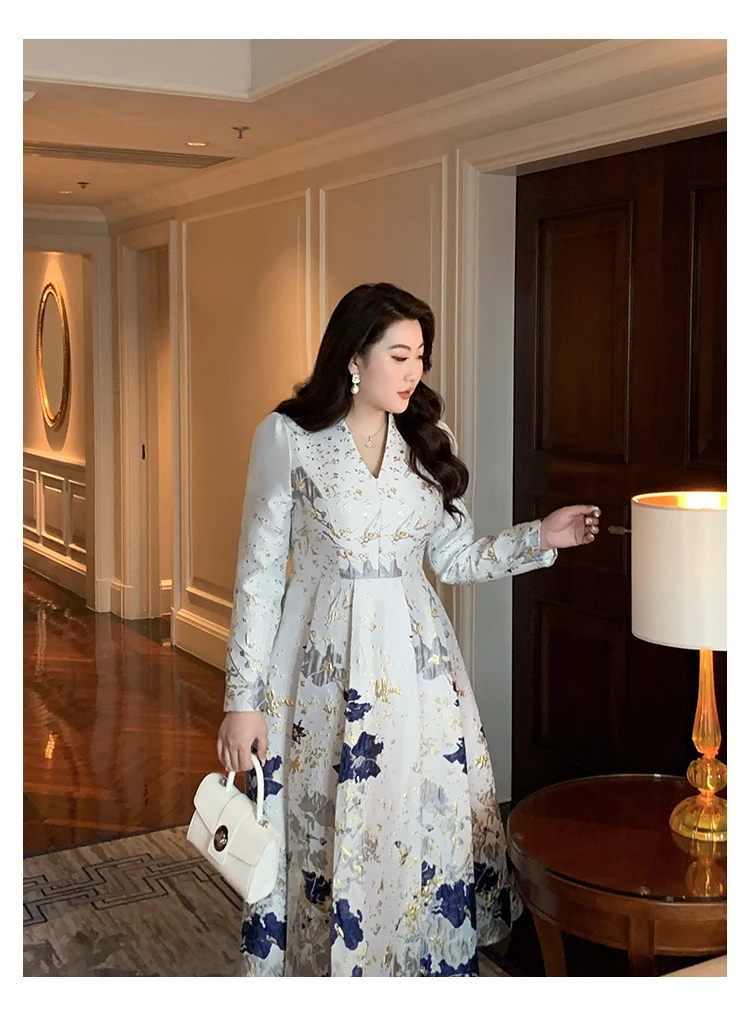 Luxury New Plus Size Elegant Dress - Light Blue Gold Pattern V-Neck Long Sleeve Tummy-Control Flared Soft Style Maxi Dress