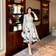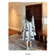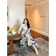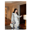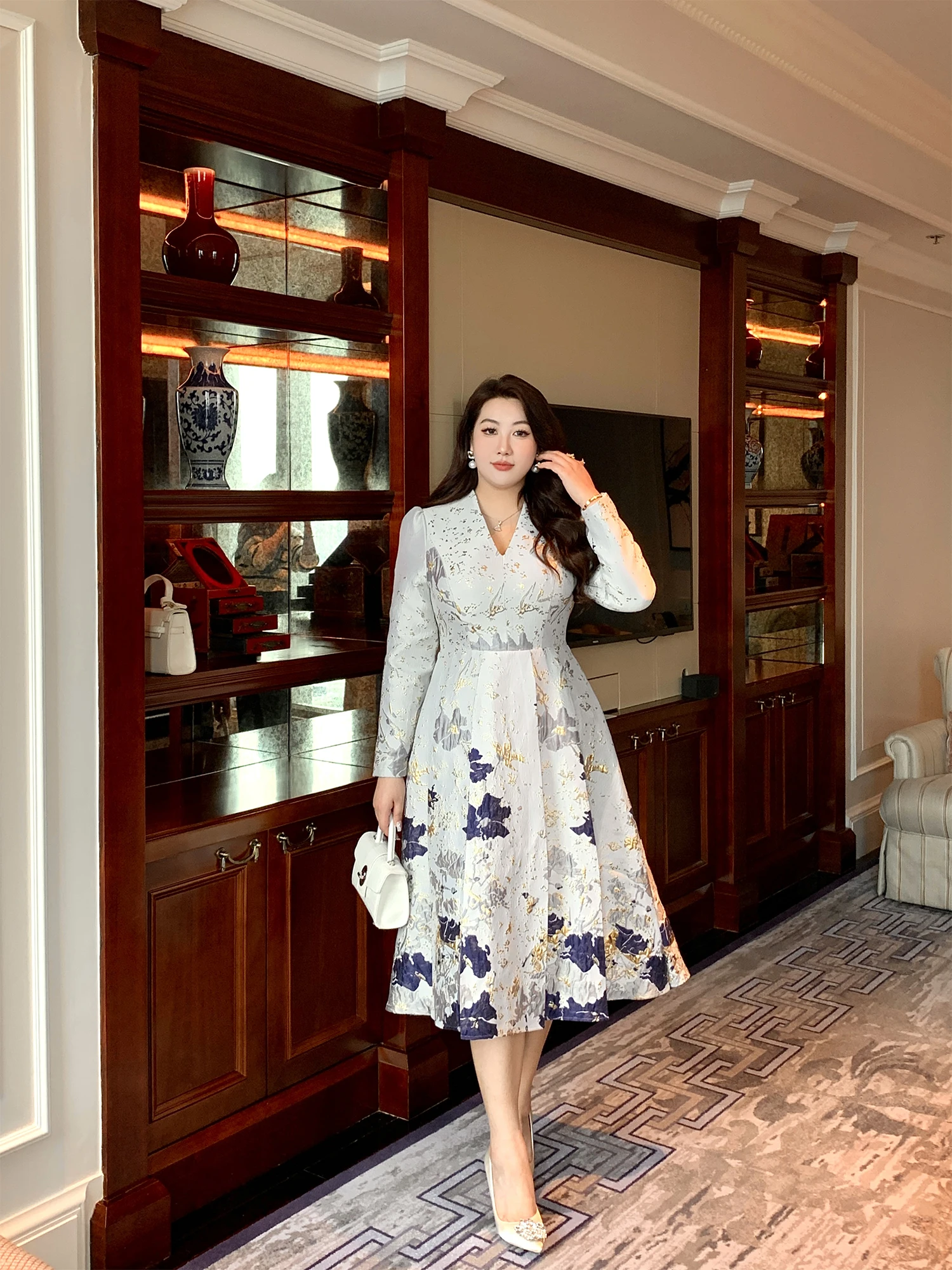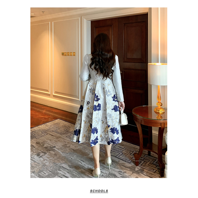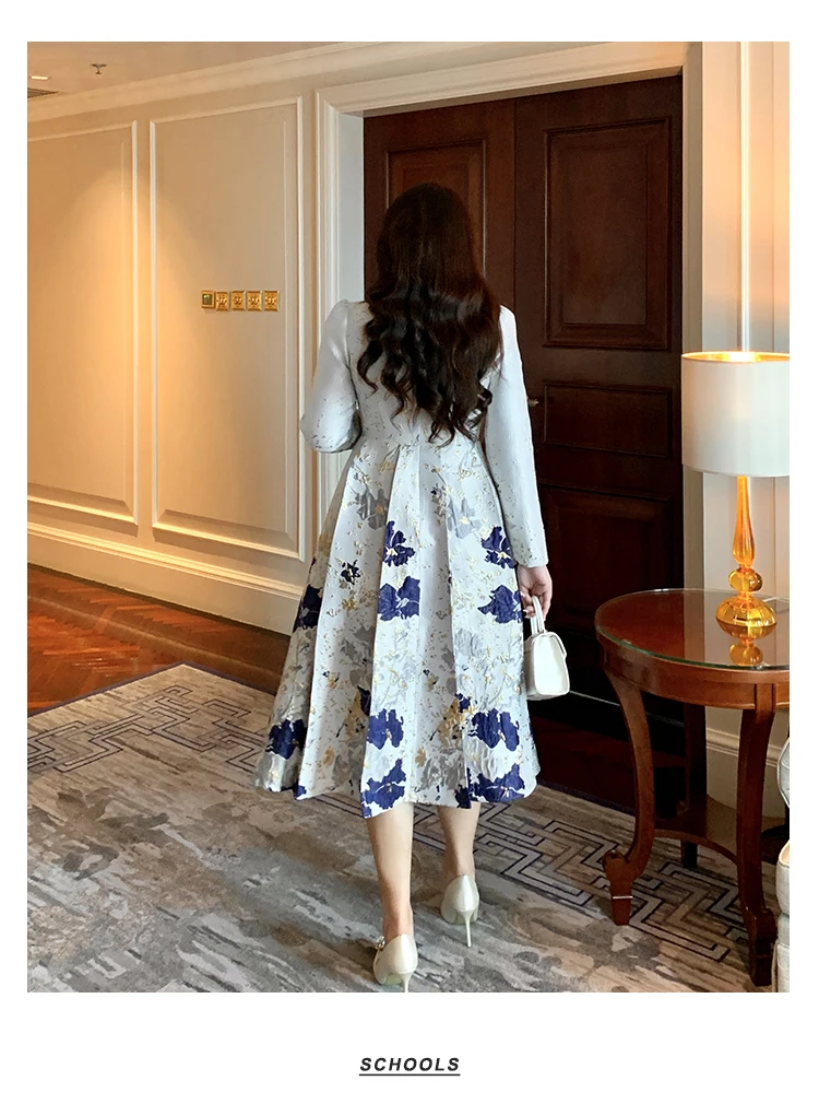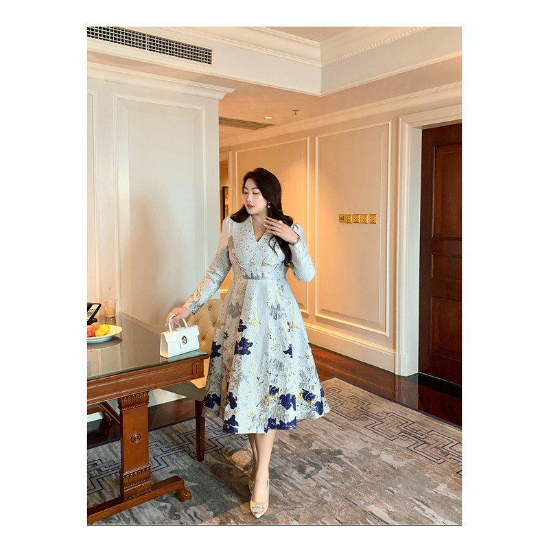 Luxury New Plus Size Elegant Dress - Light Blue Gold Pattern V-Neck Long Sleeve Tummy-Control Flared Soft Style Maxi Dress