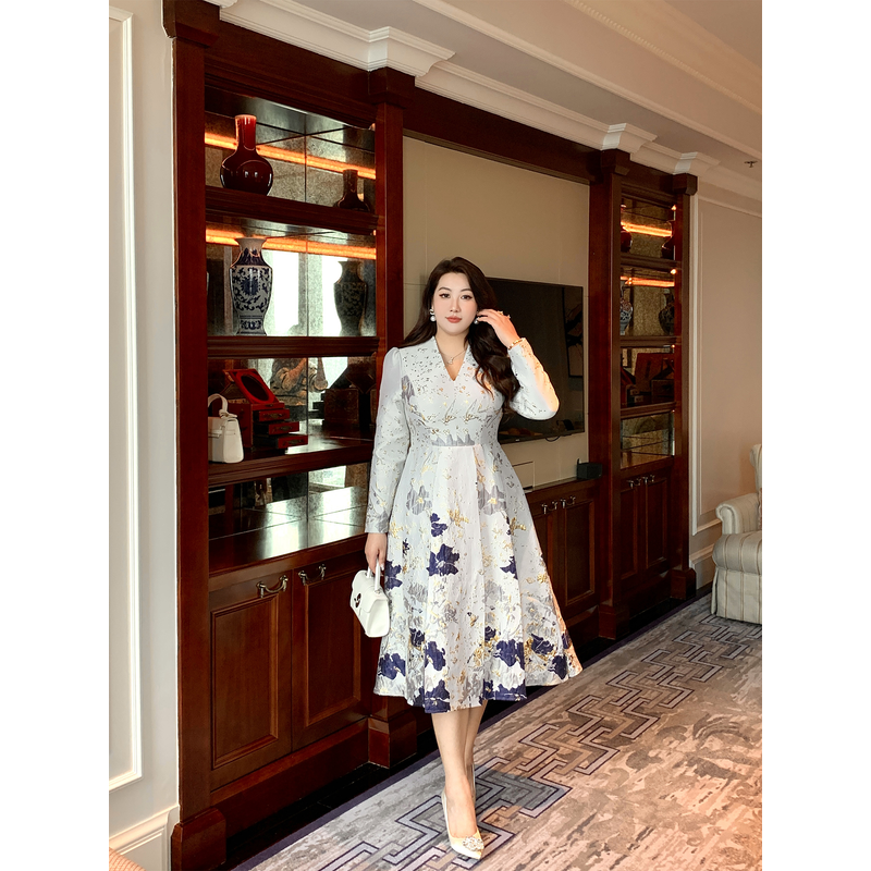Luxury New Plus Size Elegant Dress - Light Blue Gold Pattern V-Neck Long Sleeve Tummy-Control Flared Soft Style Maxi Dress