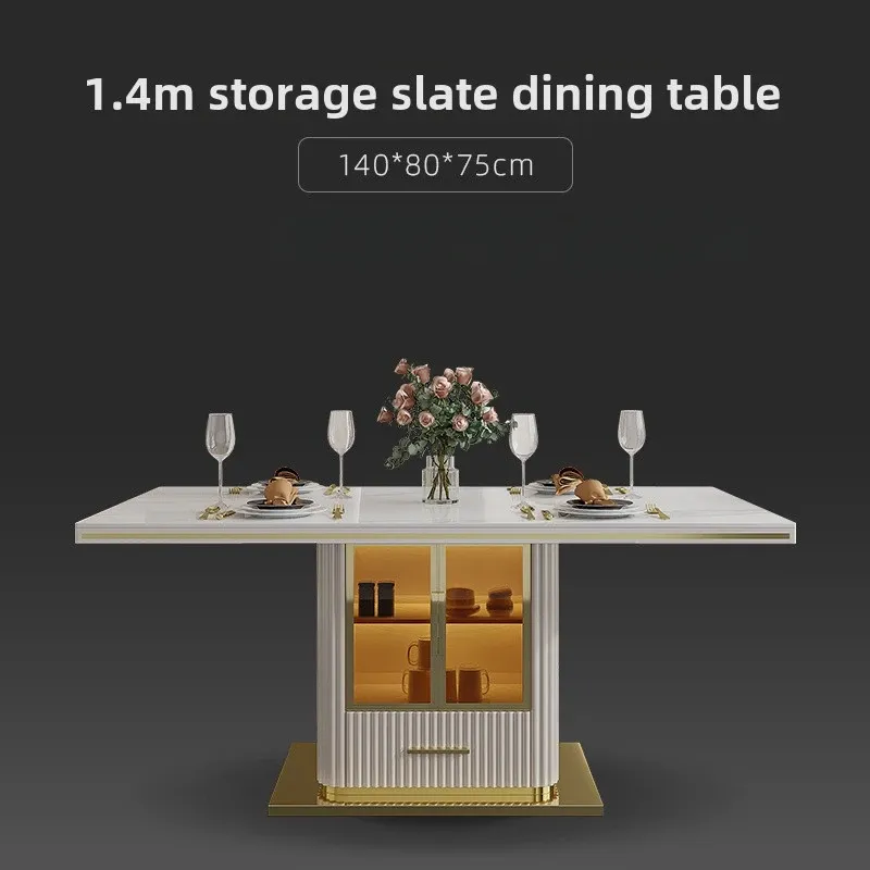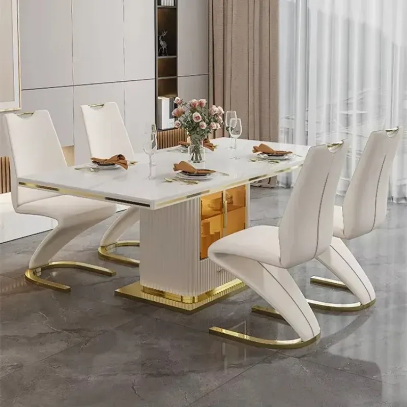 Luxury Slate Marble Modern Stainless Steel Rectangular White Dining Room Table Set with 6 Seater Restaurant 4 Chair Furniture