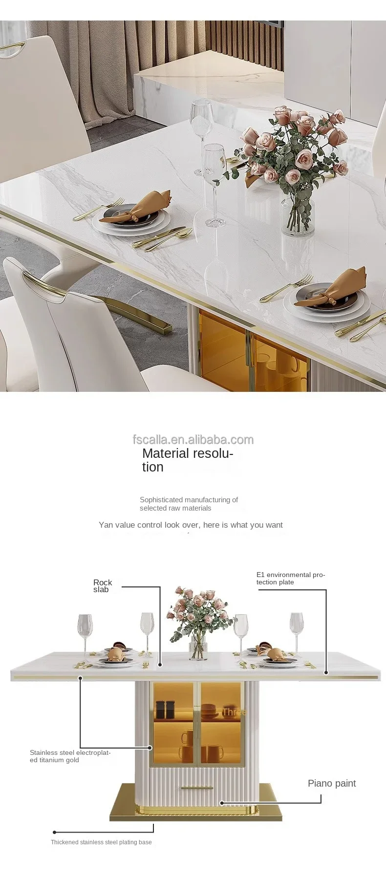 Luxury slate marble modern stainless steel rectangular white dining room table set with 6 seater restaurant 4 chair furniture
