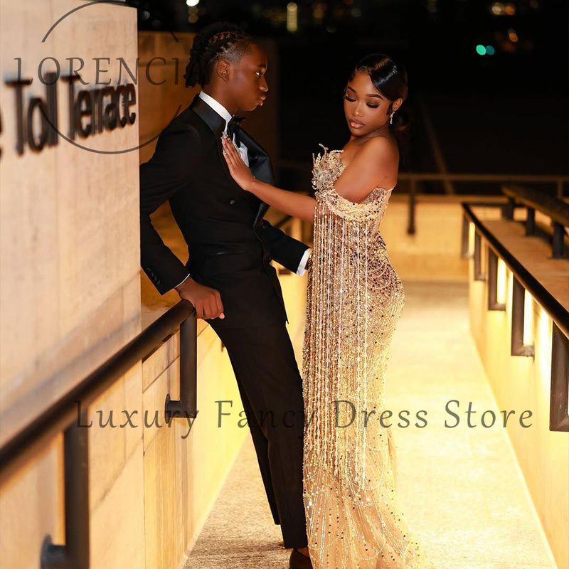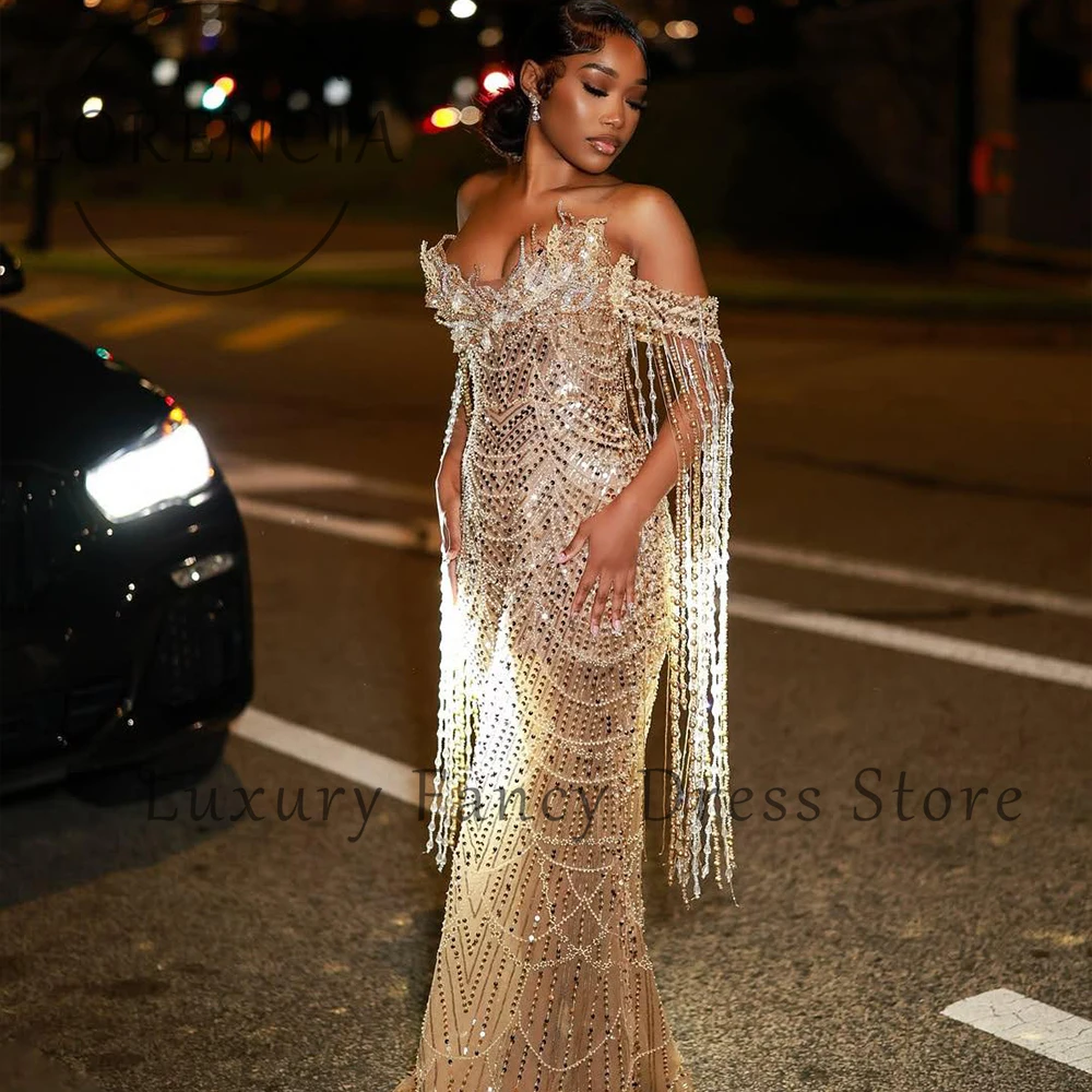 Luxury Sparkly Tassel Prom Dresses Beading Mermaid Evening Party Gowns Customized Off Shoulder Starpless robe de soiree dubaï