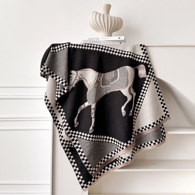 Luxury Women's Thick Faux Cashmere Scarf - Winter Warm Vintage Plaid & Warhorse Print Soft Shawl for Travel & Daily Wear