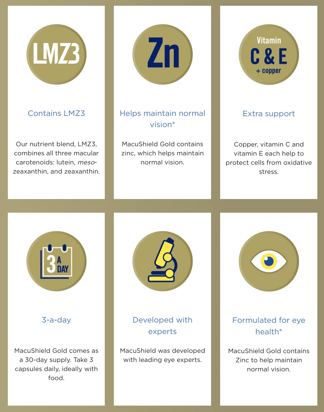 MacuShield Gold combines our blend of all three macular carotenoids, LMZ3, with additional vitamins and