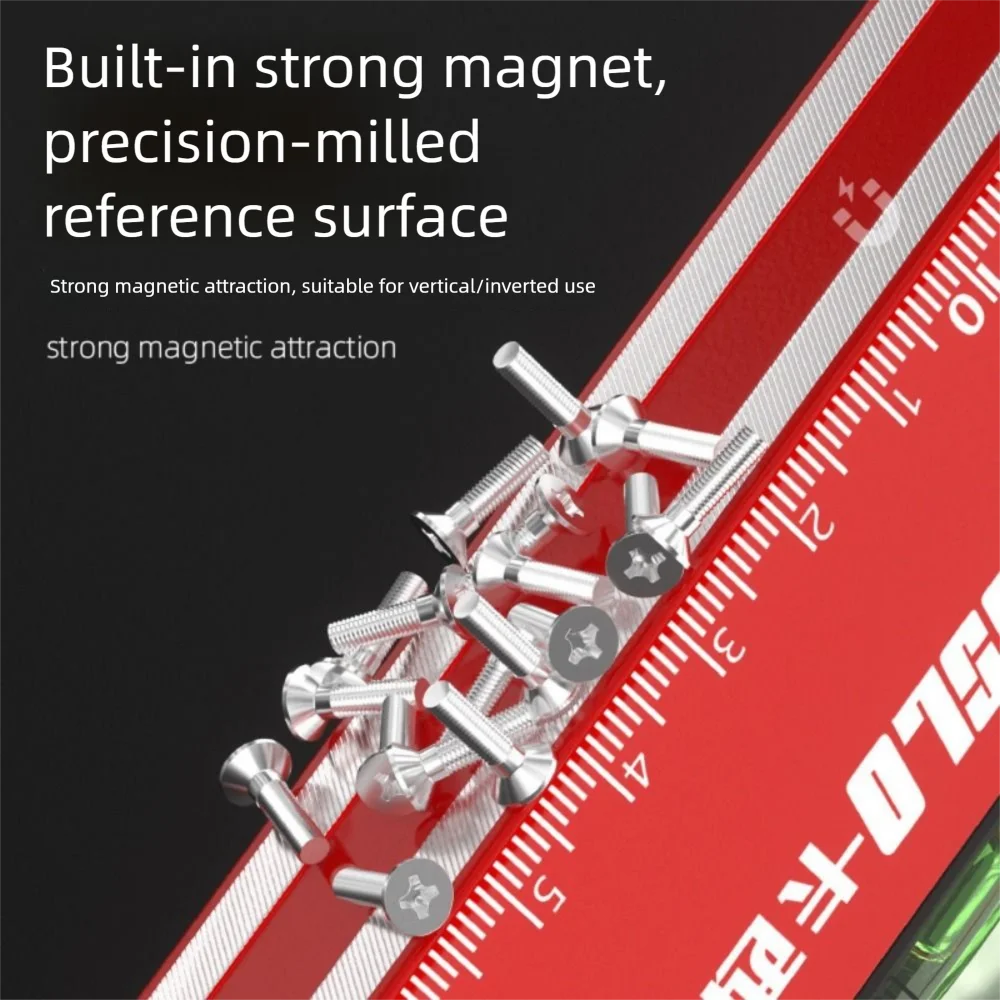 Color: Red Material: Aluminum Alloy,Plastic Power Supply: 2xAAA Battery(Battery Not Includes) Size: 30*4.9cm(11.81*1.93in),40*4.9cm(15.75*1.93in),50*4.9cm(19.69*1.93in) Package Includes: 1pc Digital Protractor 1. Magnetic adsorption: Strong magnetic adsorption design, firmly adsorbing iron metals. 2. Accurate horizontal measurement: Accurate horizontal measurement at angles of 0 ° -90 °, with an accuracy of 0.05 °. 3. Three line large horizontal bubble: double-layer sealed protective cover, more accurate horizontal measurement 4. High flatness anti slip: more accurate measurement, anti slip and wear-resistant.