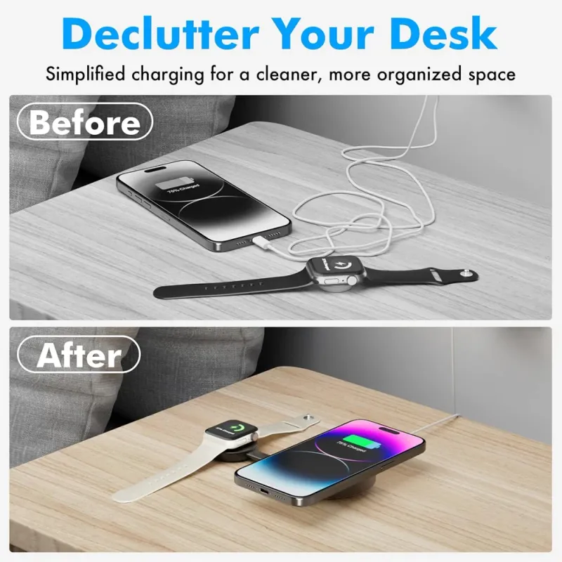 This charger is designed to work seamlessly with iPhone 17/16/15/14/13/12 Series and AirPods 3/2/Pro 2/3, as well as Samsung devices.