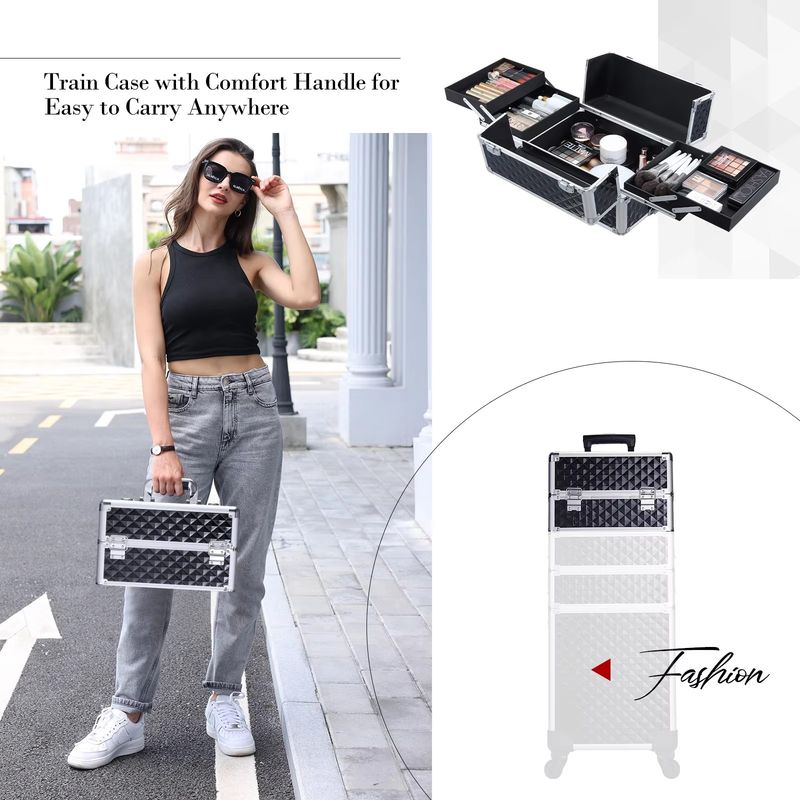The first layer of the rolling makeup case professional is a tray with 4 large tiers trays spaces, which can store your cosmetics, jewelry, and handicrafts. In addition, the box can be carried with you, which is portable and convenient.