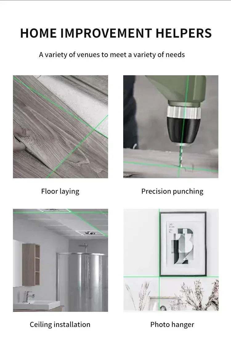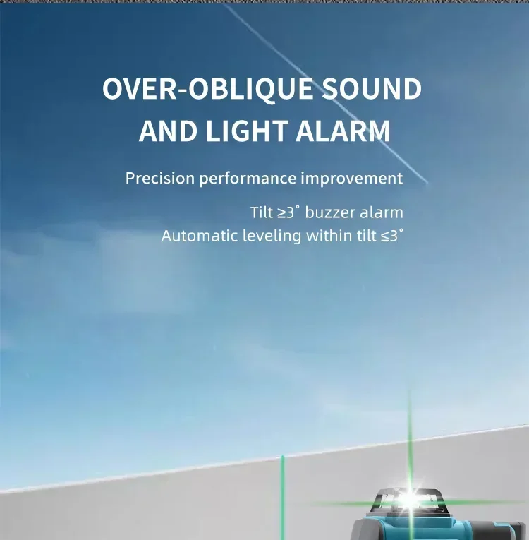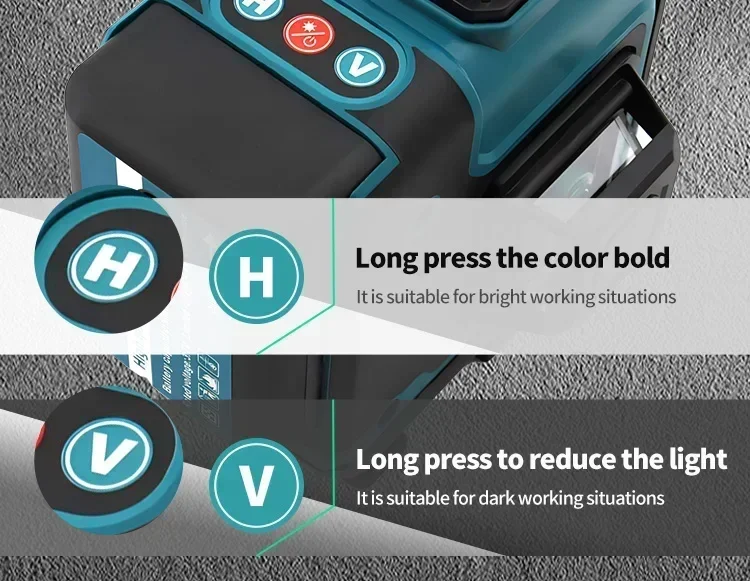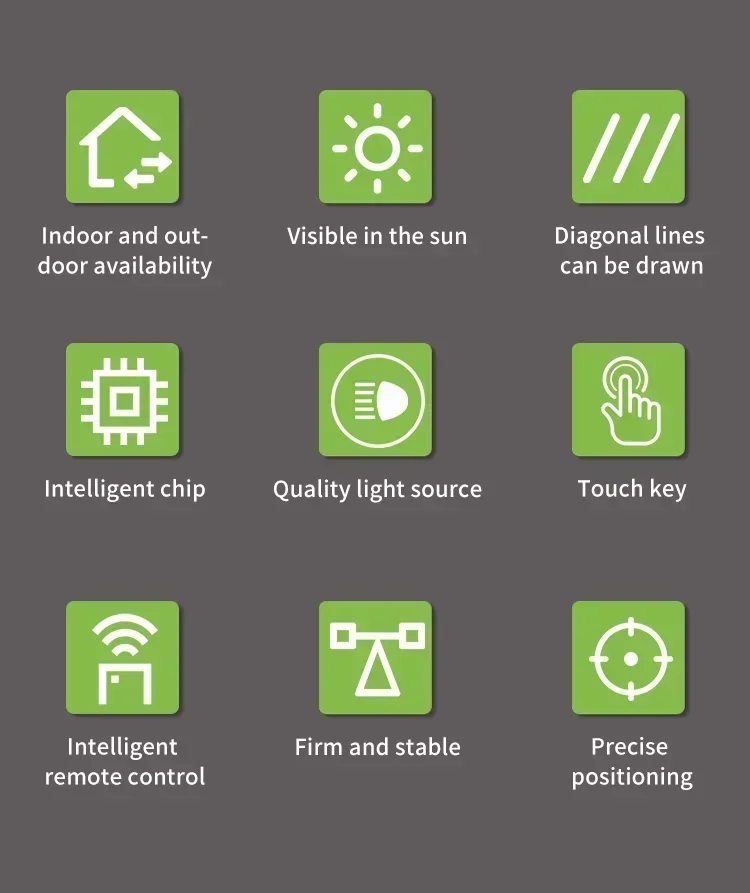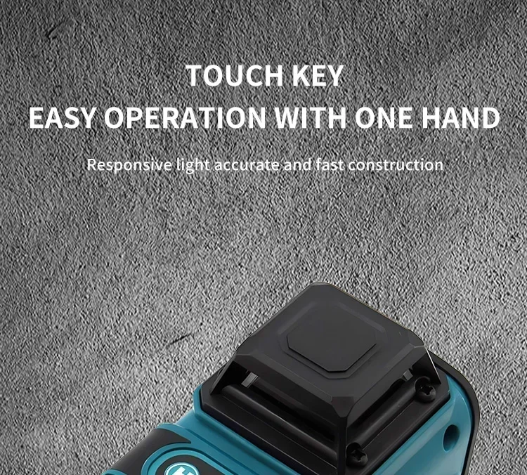 Laser ray: 360° X 4 16 lines(3D-4D) 1) Place the instrument on the tripod, T-type wall mounting bracket or lifting platform as needed; 2) Push the main power switch forward to the ONposition and the machine starts to work. Thehorizontal window automatically opens and produces four horizontal laser rays; 3) Touch H key on the touch panel to control horizontal opening and closing; 4) Touch the V key on the touch panel once, open a vertical window with one click (tick), repeat again, the second vertical window opens, and the third touch closues two vertical windows; 5) Long touch the key for more than 3 seconds, and a click(tick) will be heard, and turning on the diagonal function. At this time, you can adjust it to the angle you want without alarm or flashing. 6)Touch this key again for more than 3 seconds, with one click (tick) to release this function, the instrument works normally.