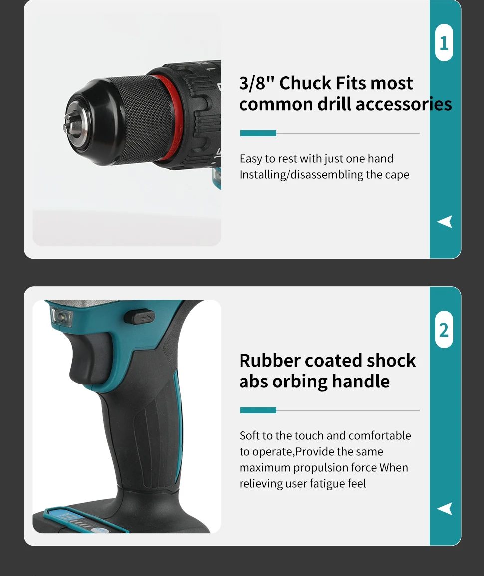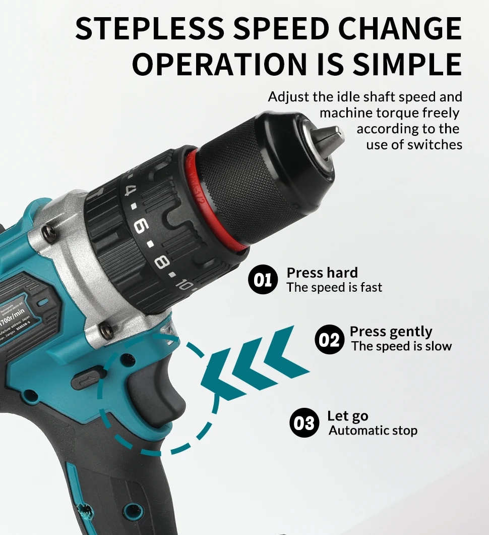 • Core Features: Brushless motor, stepless speed control, forward/reverse switch, LED light, soft rubber handle, thermal insulation cover