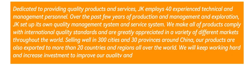 Multiple types   Liftable/non-liftable according to different needsMORE DETAILED DISPLAY1High and low gear switching2High and low gear switching3hydraulicsystem4control PanelCUSTOMERFEEDBACKSTRENGTIFACTORYDedicated to providing quality products and services, JK employs 40 experienced technical andmanagement personnel. Over the past few years of production and management and exploration,JK set up its own quality management system and service system. We make all of products complywith international quality standards and are greatly appreciated in a variety of diferent marketsthroughout the world. Selling well in 300 cities and 30 provinces around China, our products arealso exported to more than 20 countries and regions all over the world. We will keep working hardand increase investment to improve our auality and