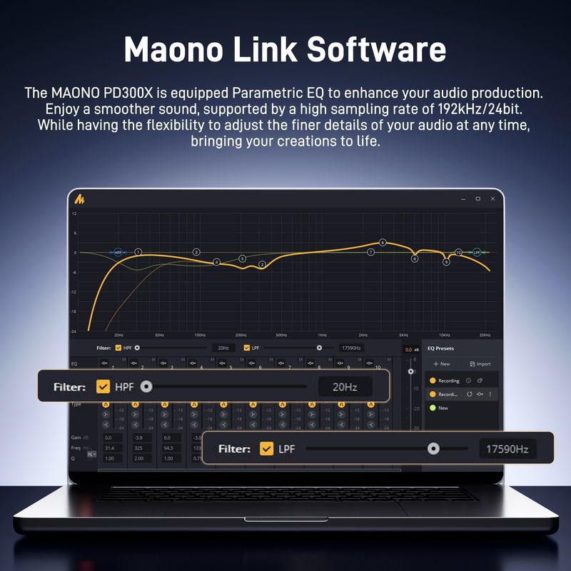 Professional Audio Settings, Tailored Just For You: Enjoy a flexible and efficient workflow with MAONO Link, which includes a range of limiters, compressors, and high-pass filters. The visual EQ adjustment interface makes sound tuning straightforward. Customize the parameters to discover your unique sound and create your podcast in your own distinctive style. You can make other fine adjustments to achieve a personalized tone