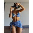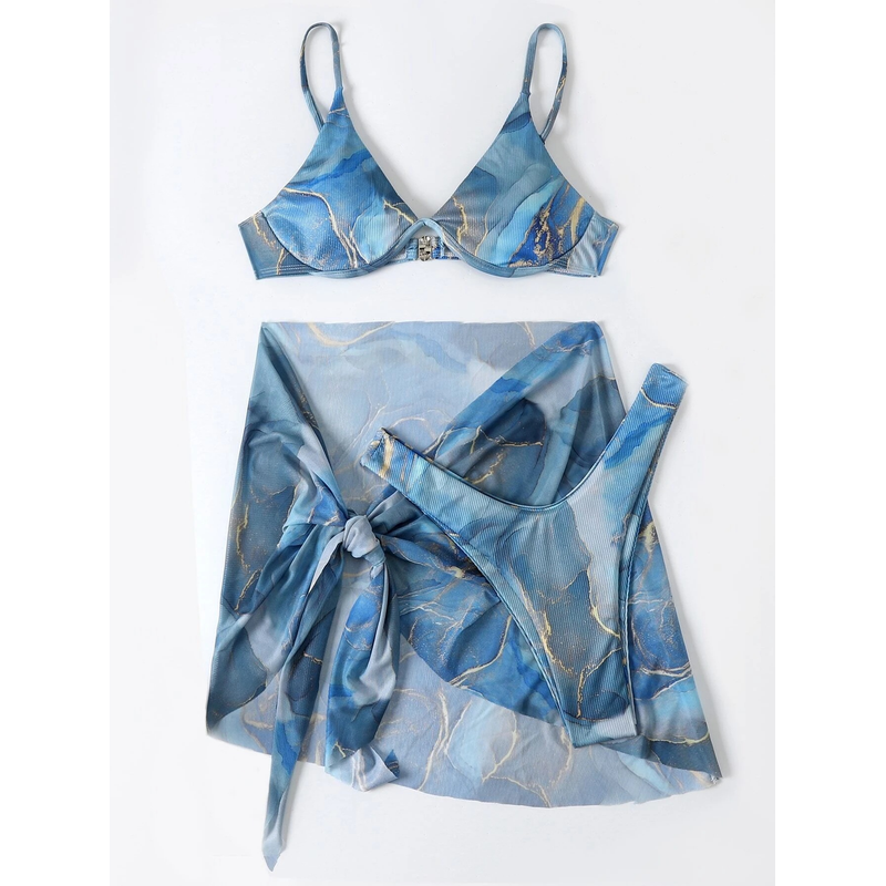 Marble Printed Lingerie 3pcs Bikini Swimwear Summer Blue S