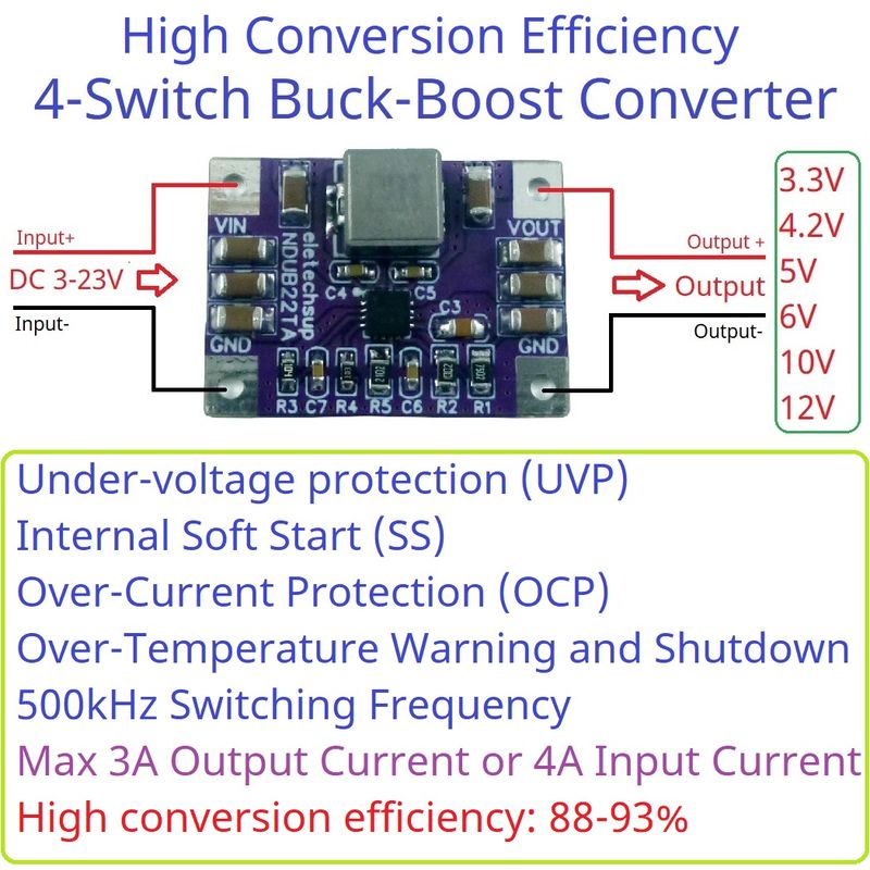 Product Name:Max 3A Synchronous 4-Switch High Efficienc DC-DC Buck-Boost Converter Module 3-23V to 3.3V 4.2V 5V 6V 10V 12V Voltage Regulator