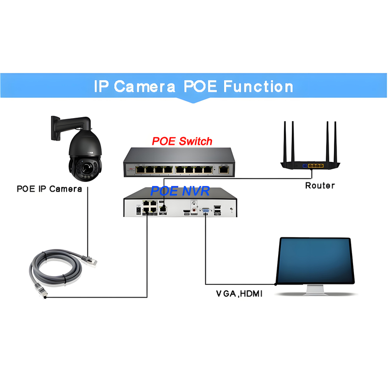 • This Camera is POE PTZ Camera ,it can powered by 12V Power adapter,POE Switch,Poe injector or POE NVR.it can be controlled by phone(APP),PC(Web Browser,PC Software) and DVR NVR.