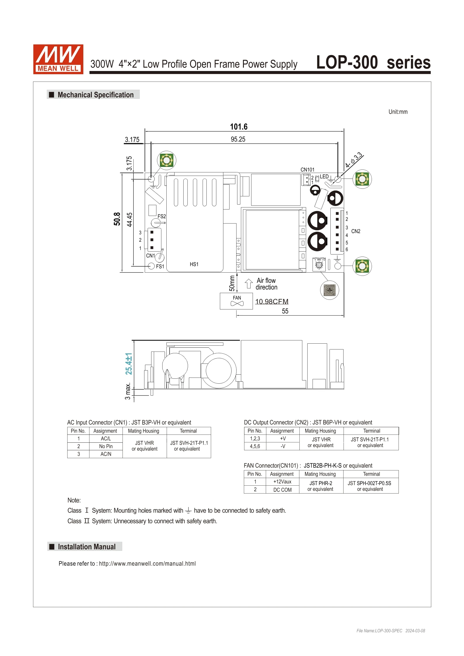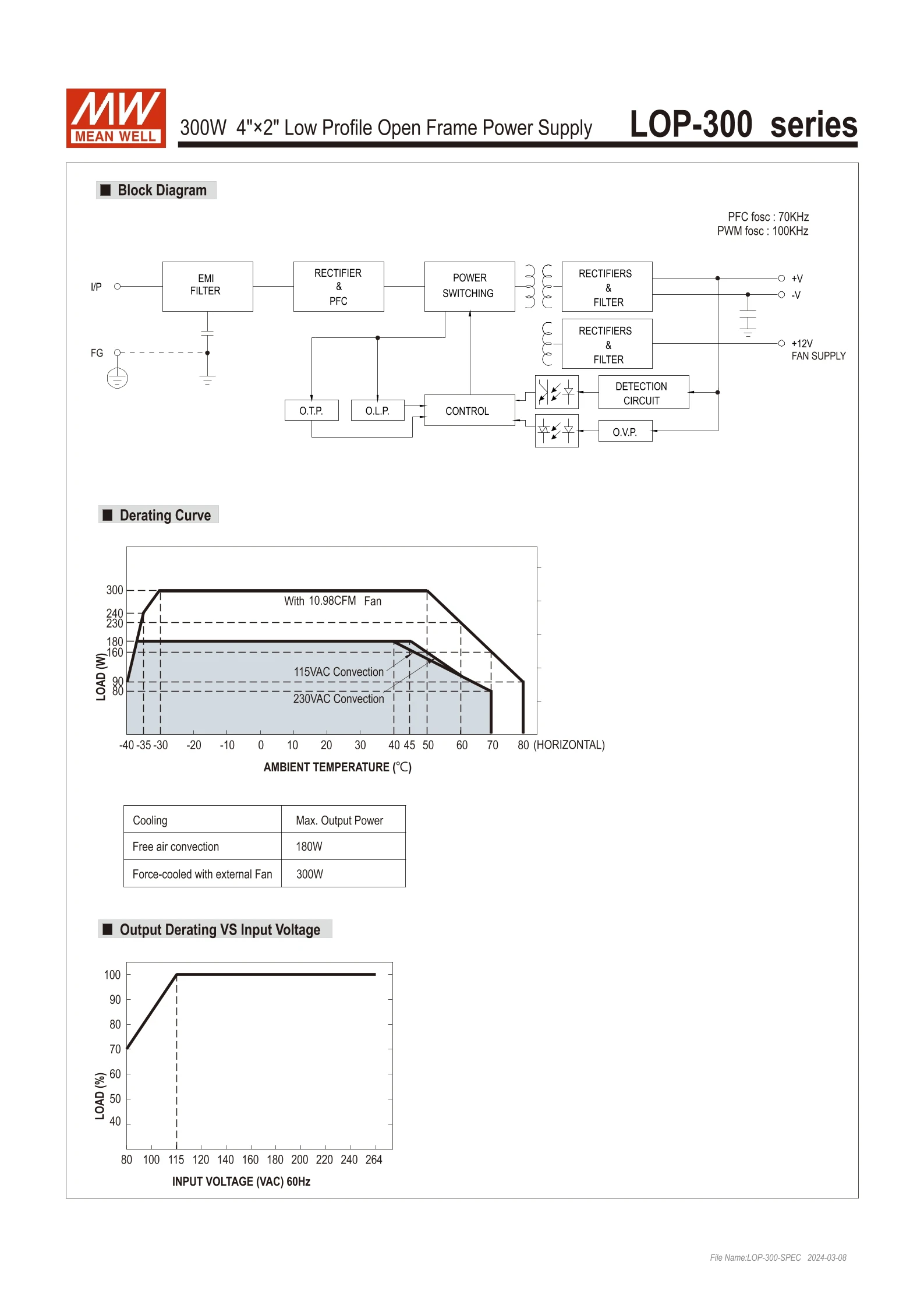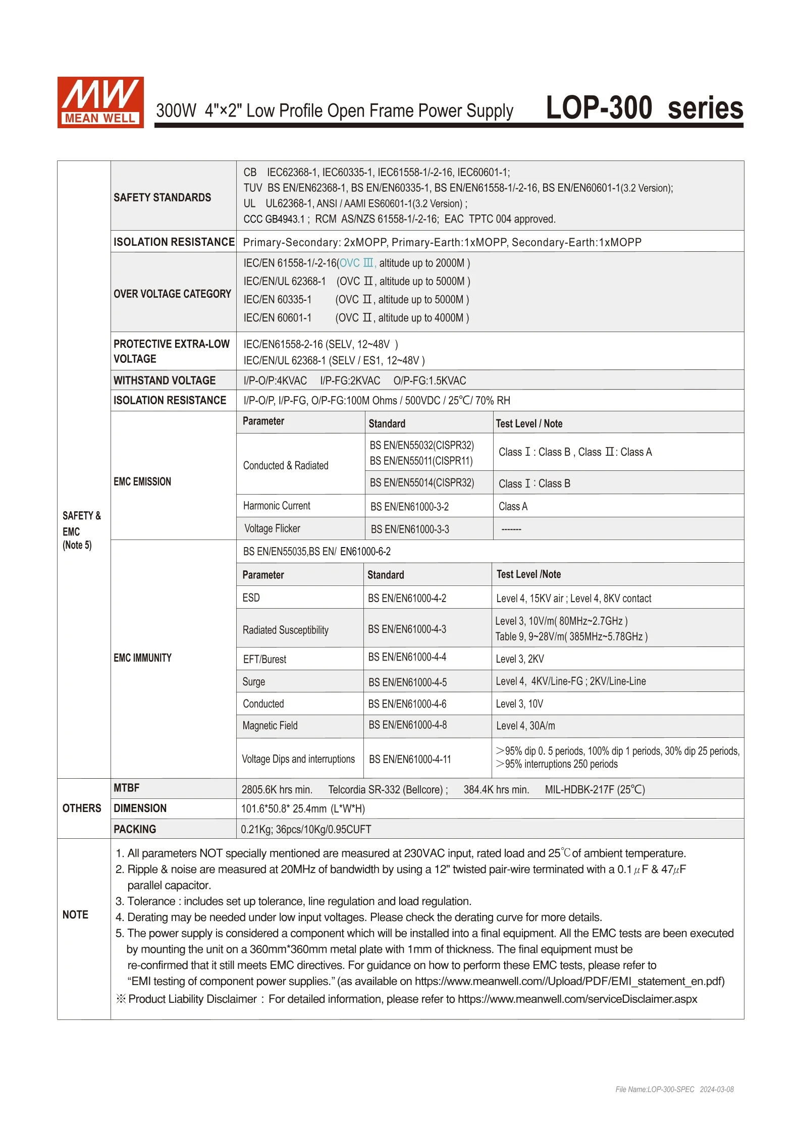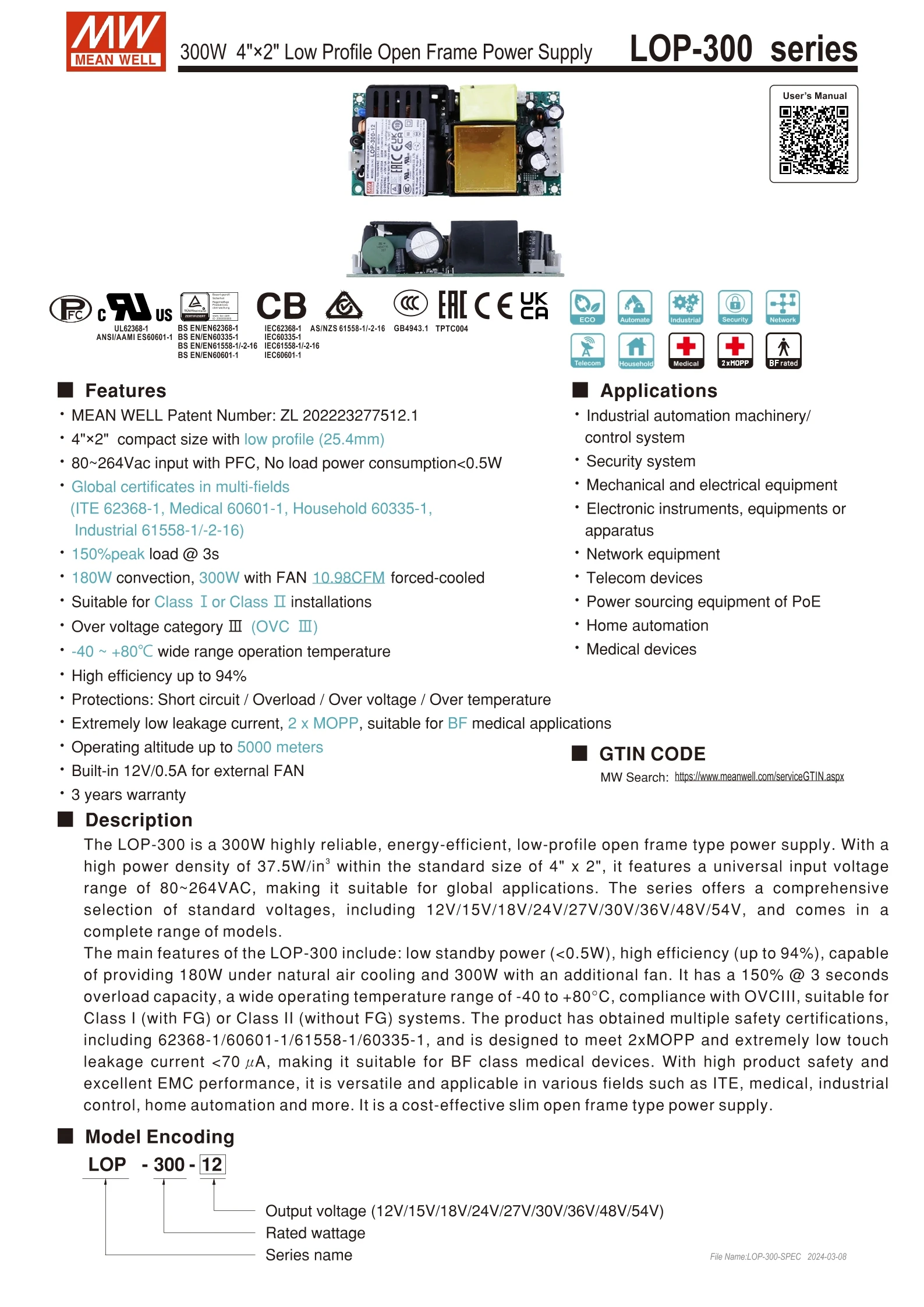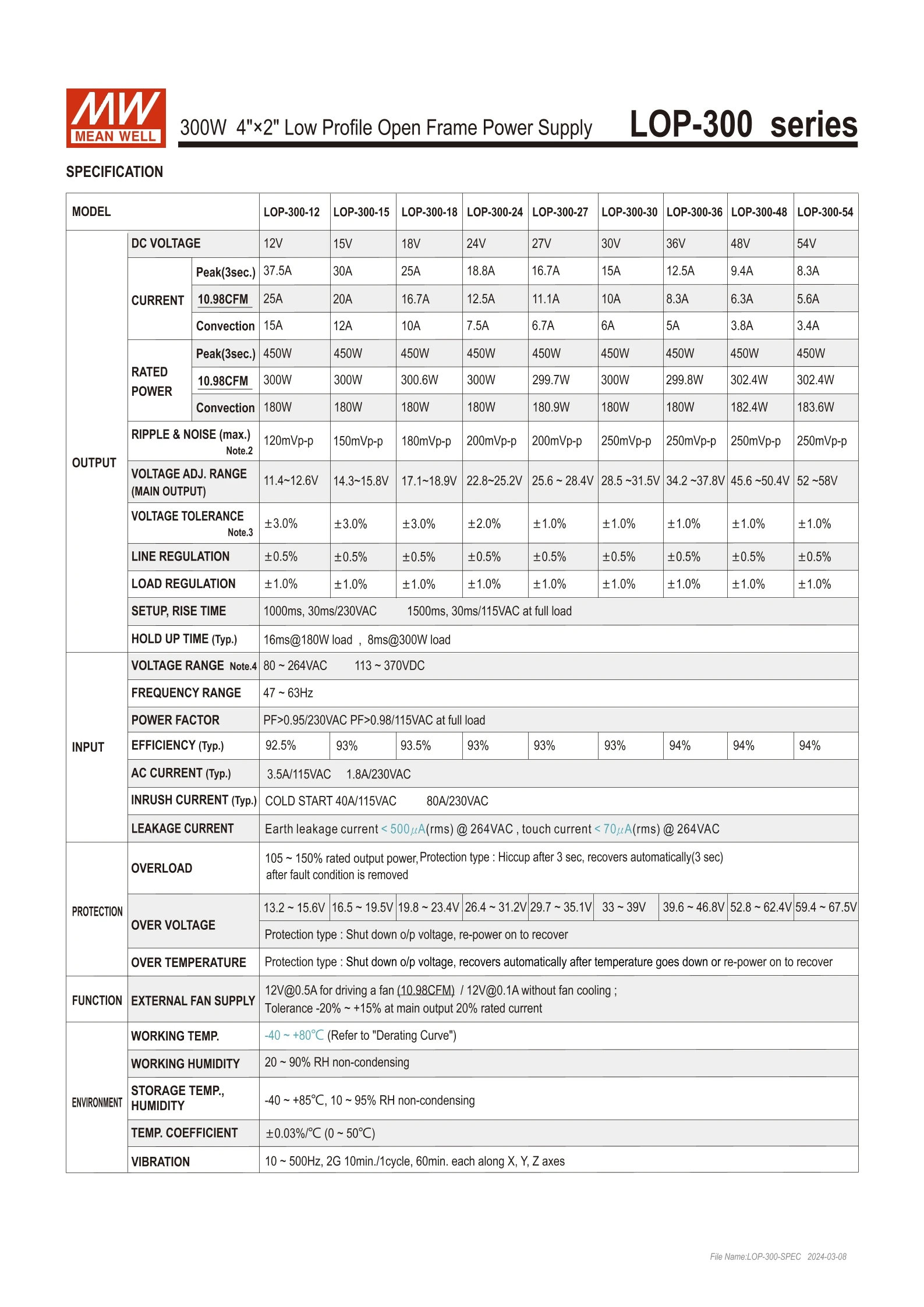 MEAN WELL 300W 4"×2" Low Profile Open Frame Power Supply LOP-300 LOP-300-12 LOP-300-15 LOP-300-18 LOP-300-24 LOP-300-27