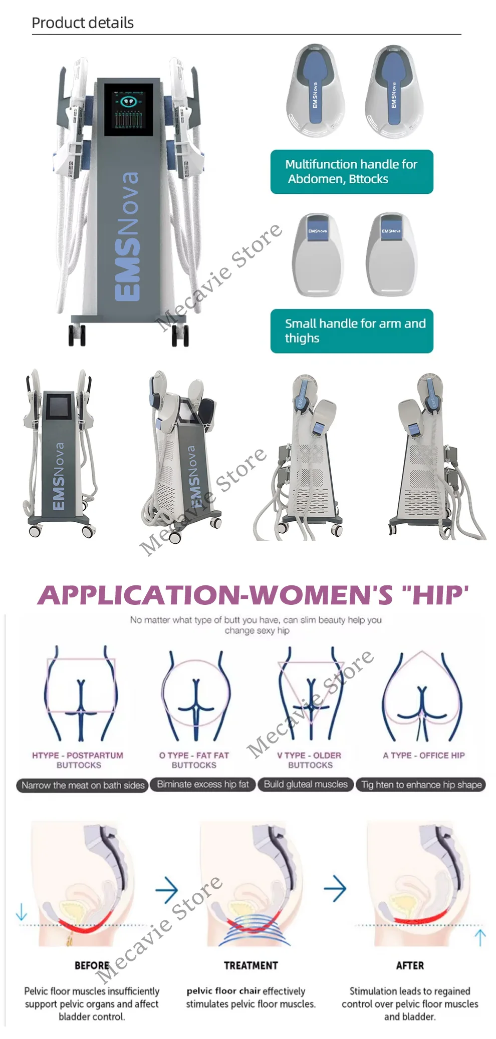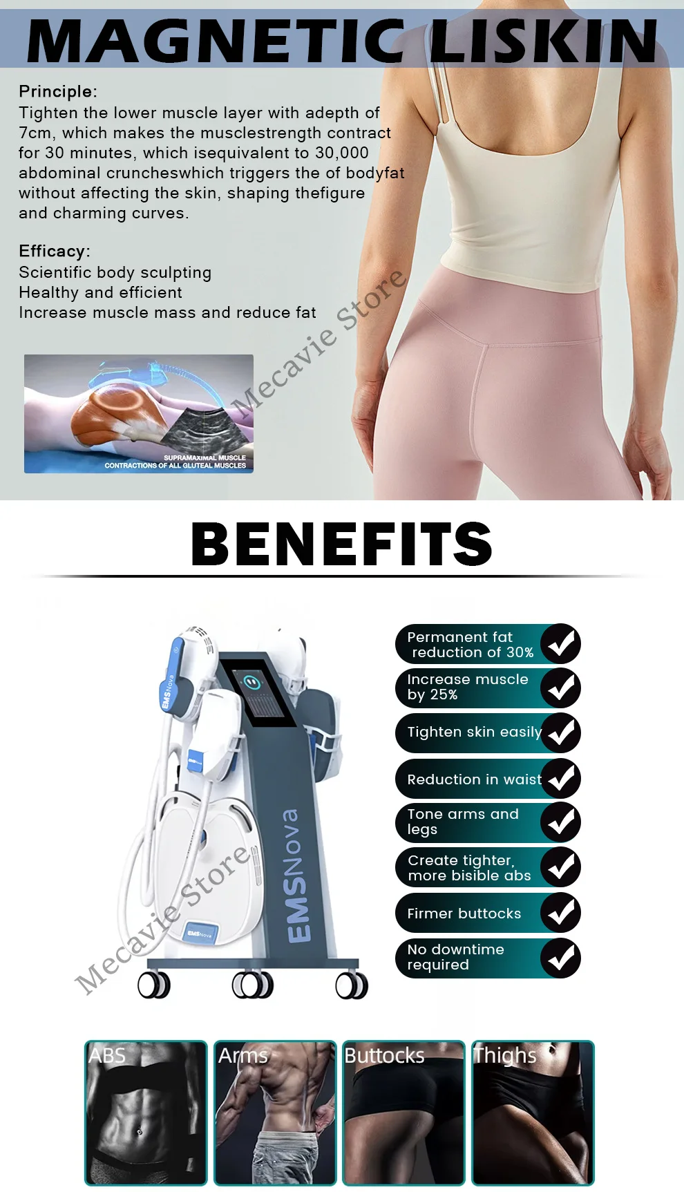 By using HI-EMT( high energy focused electromagnetic wave) technology to expand and contract muscles, limit training, and deep remodeling of muscle internal structure, That is, the growth of myofibrils (muscle enlargement) and the production of new protein chains and muscle fibers (muscle hyperplasia) to train and increase muscle density and volume.