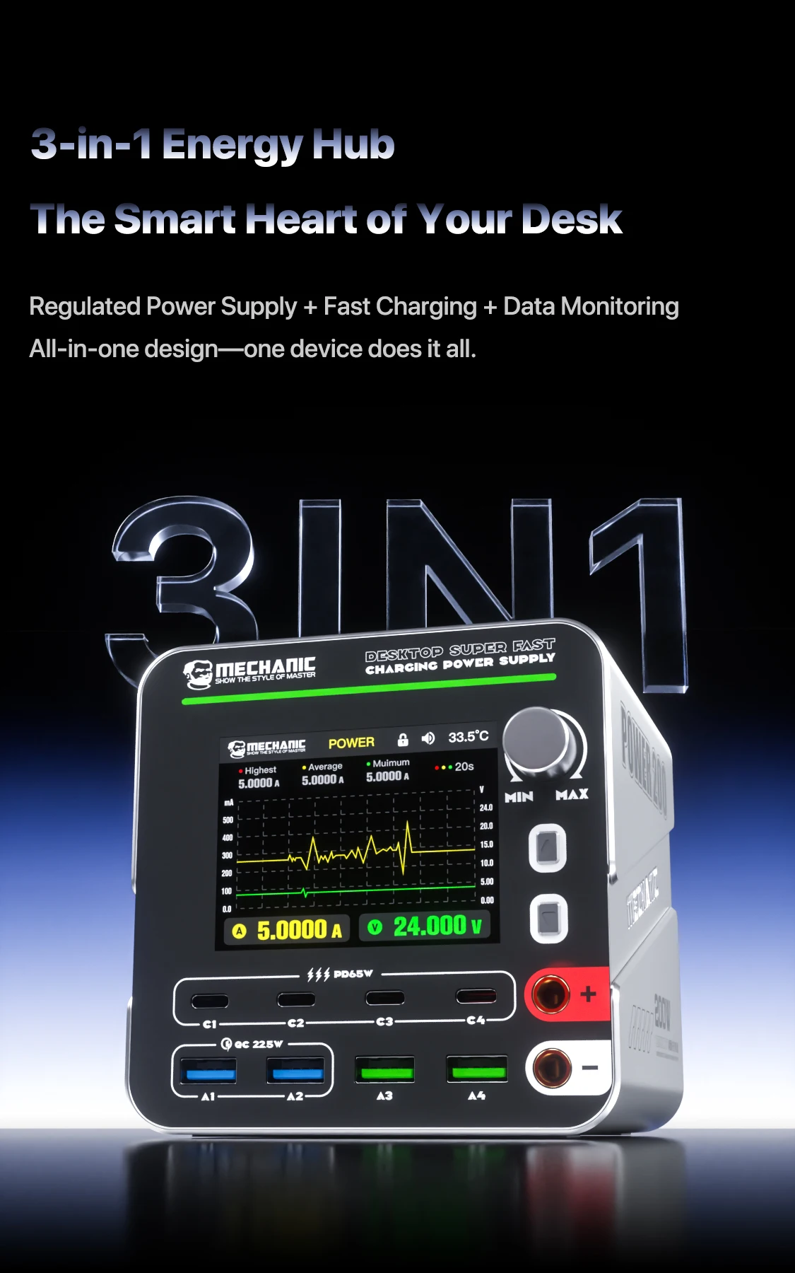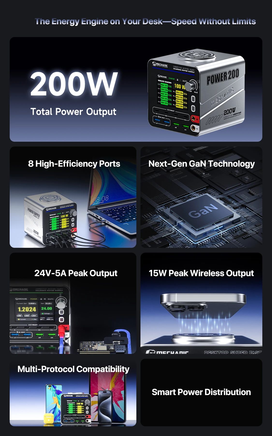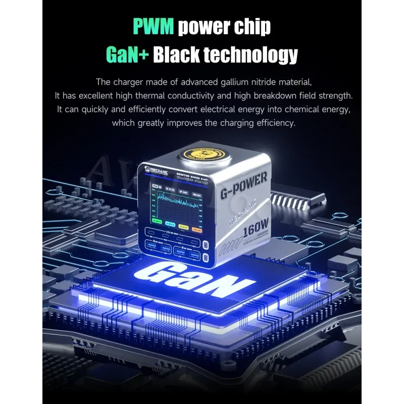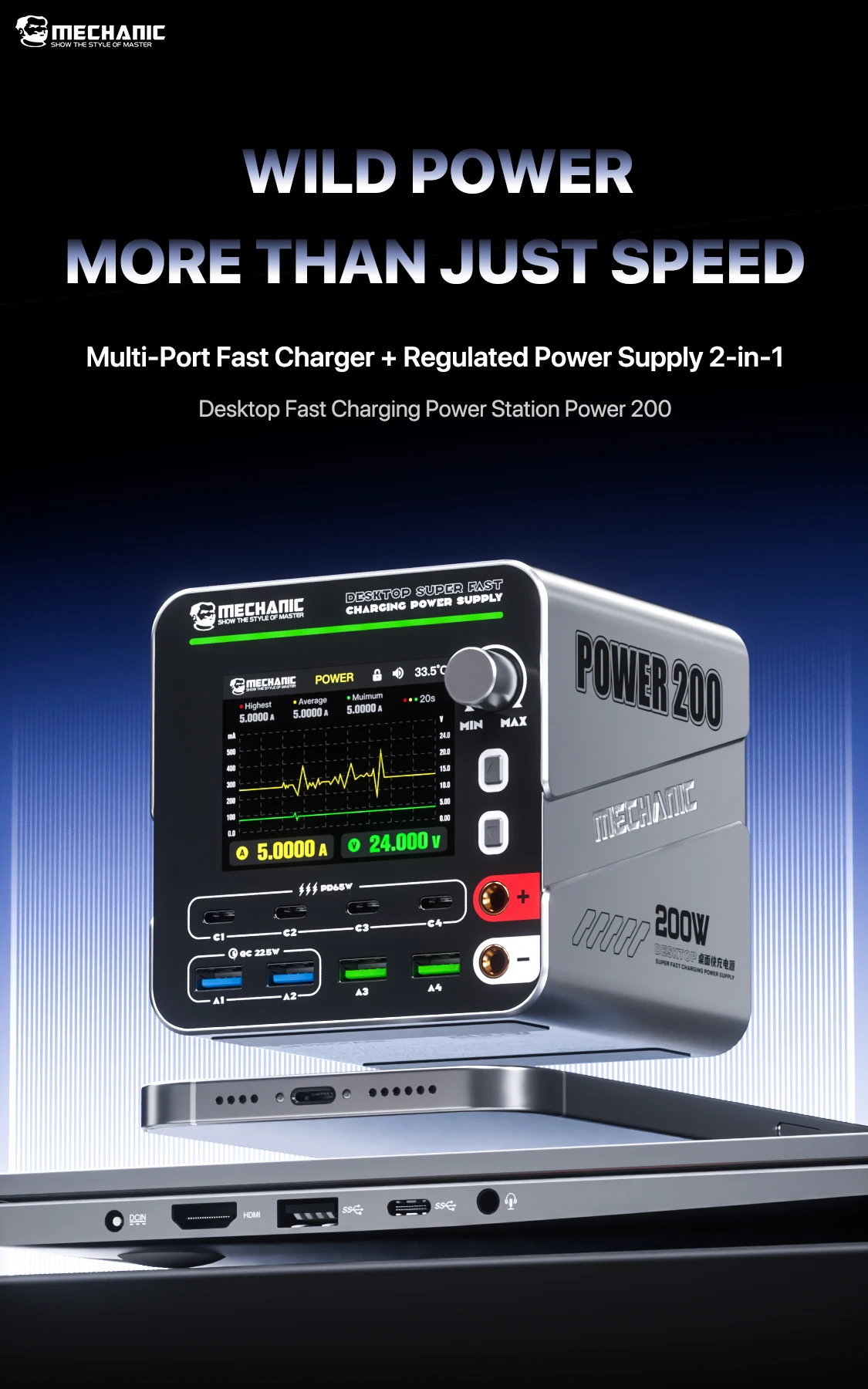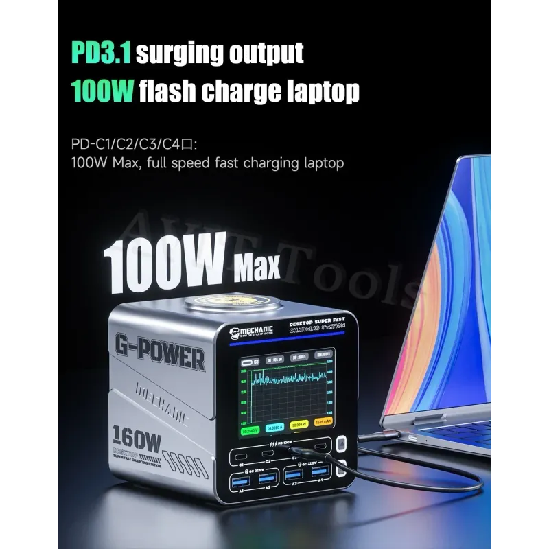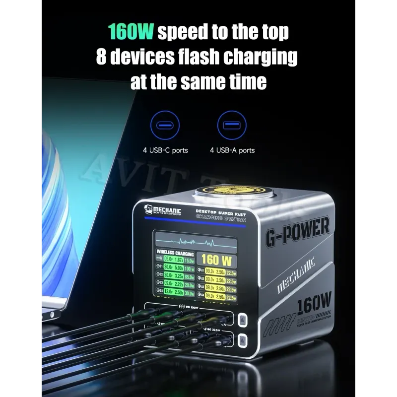 MECHANIC G-Power Nitride-Gallium Desktop Super Fast Charging Station  Multi-Port Real-Time Power 200 Display Wireless Charging