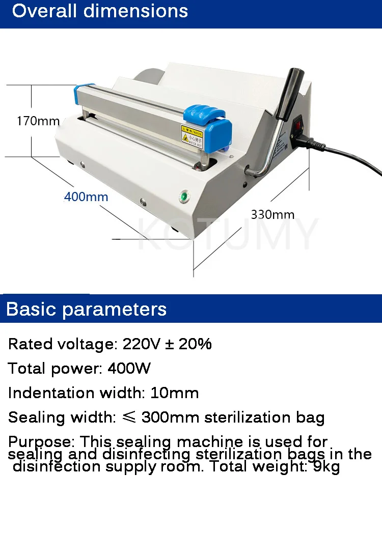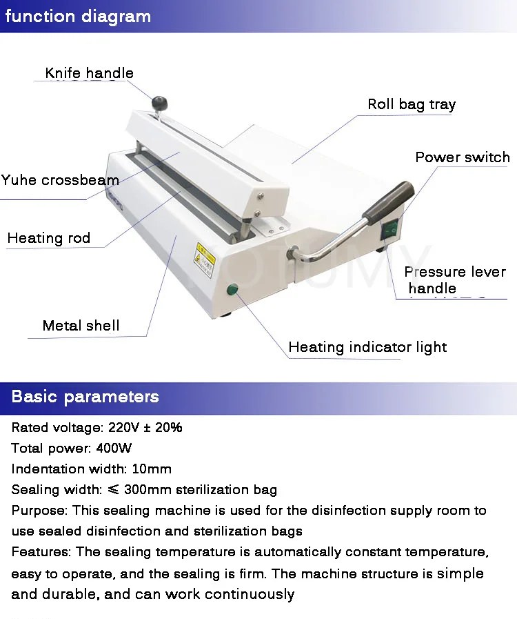 Purpose: This sealing machine is used for the disinfection supply room to use sealed disinfection and sterilization bags