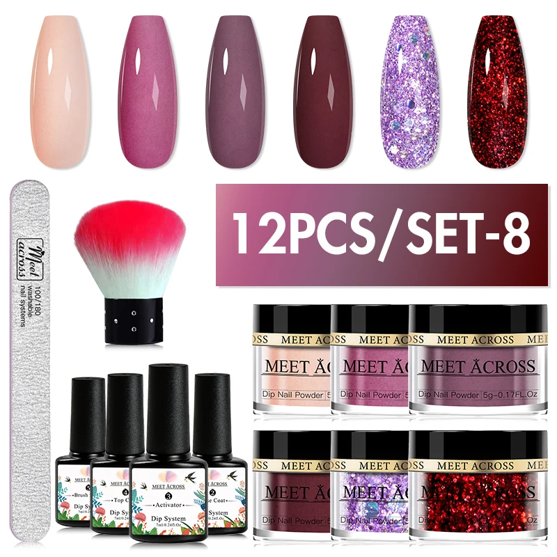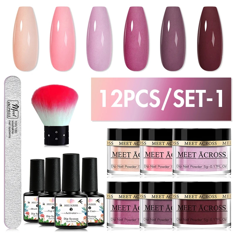 MEET ACROSS 12Pcs/Set Crystal Nude Pink Dipping Nail Powder Set No Need Lamp Nail Art Dipping Powder System Gel Nail Polish Kit