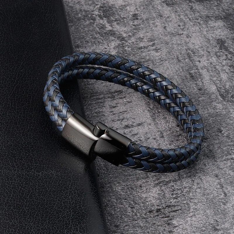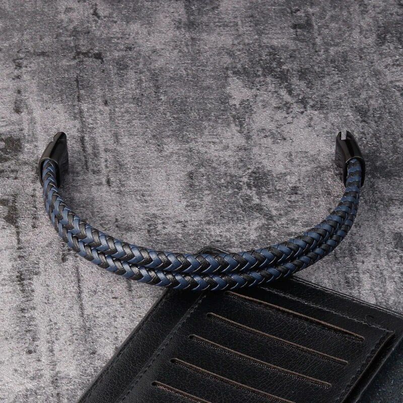 Men Black Blue Braided Genuine Leather Bracelet Double Band Bangle