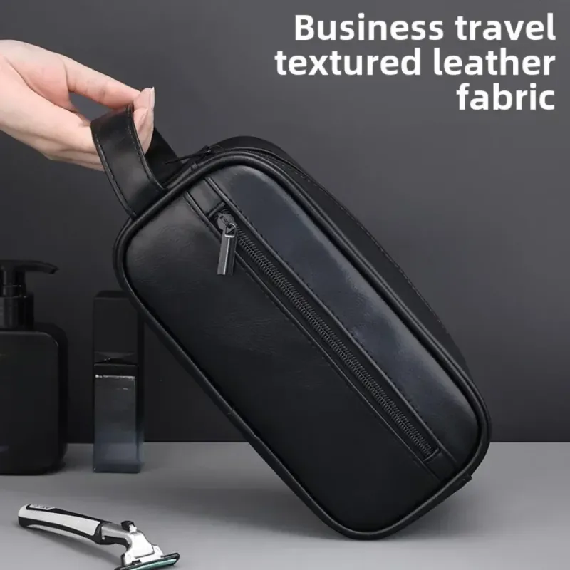 Men Leather Wash Bag Travel Business Trips Portable Cosmetic Bag Large Capacity Multi Pocket Design Handheld Leather Wash Bag