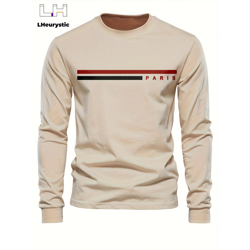 Men's 100% pure cotton summer loose comfortable casual PARIS print large round neck long sleeve T-shirt top