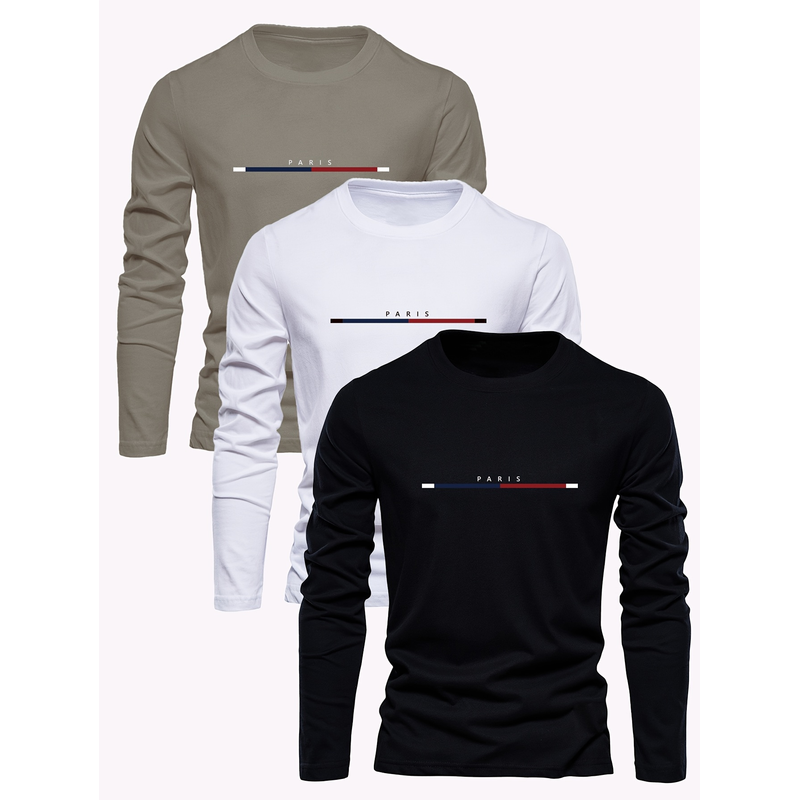 Men's 100% pure cotton summer loose comfortable casual PARIS print large round neck long sleeve T-shirt top
