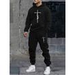 Men's autumn and winter casual fashion warm cross faith pattern print loose plush thick hooded sweatshirt+sweatpants set