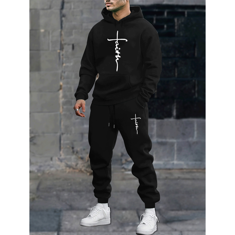 Men's autumn and winter casual fashion warm cross faith pattern print loose plush thick hooded sweatshirt+sweatpants set