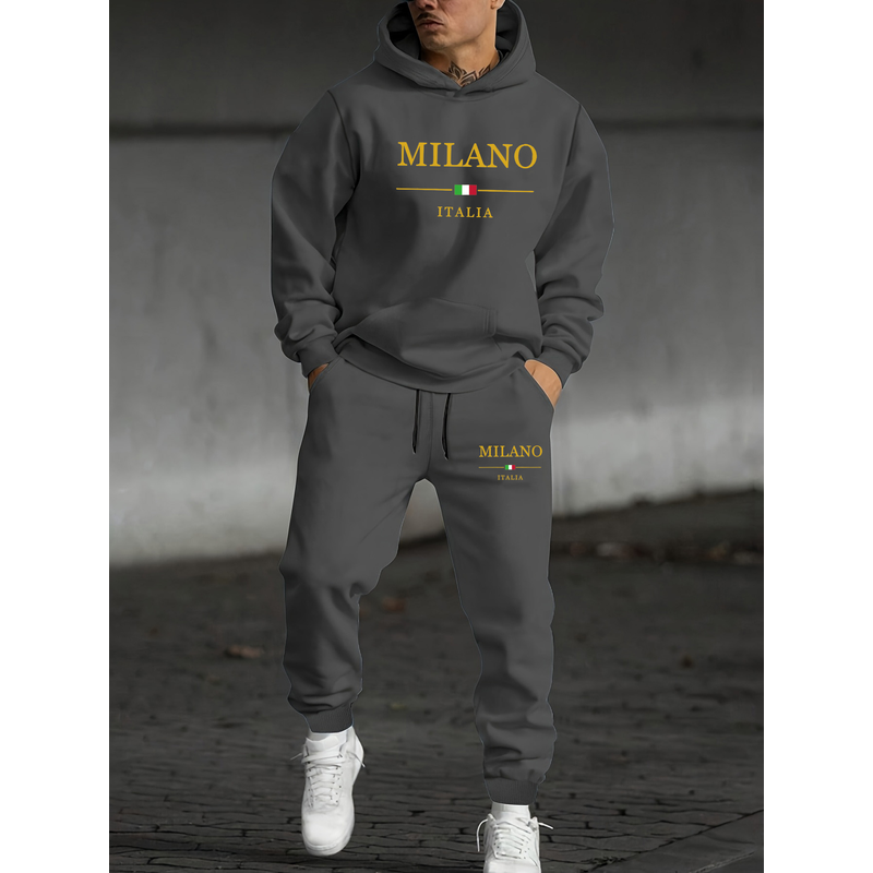 Men's autumn and winter casual fashion warm MILANO ITALIA pattern printed loose plush thick hooded sweatshirt+sweatpants set