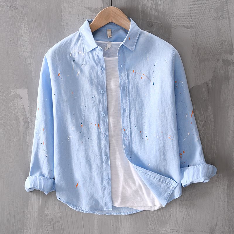 Men's Casual Linen Long-sleeved Shirt Art Sky Blue 3XL